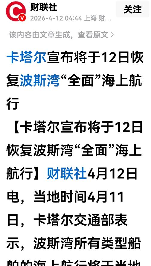 就在沙特宣布巴基斯坦驻军的同一天,卡塔尔交通部发表声明,宣布从 4 月 12 日起全面恢复波斯湾所有类型船舶的海上航行,航行时间为上午 6 时至下午 6 时,持有捕鱼许可证的船舶则可以全天航行。这一决定在美伊冲突导致霍尔木兹海峡航运几乎瘫痪的背景下,显得格外引人注目。