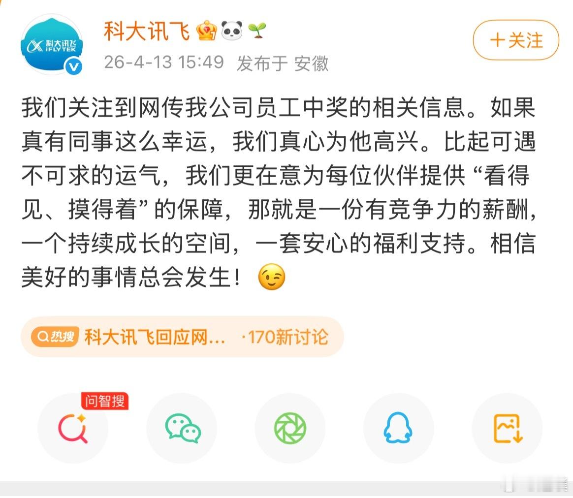 科大讯飞回应网传员工中1500万 “如果真有同事……”这句话是不是可以理解为,中奖是假的?