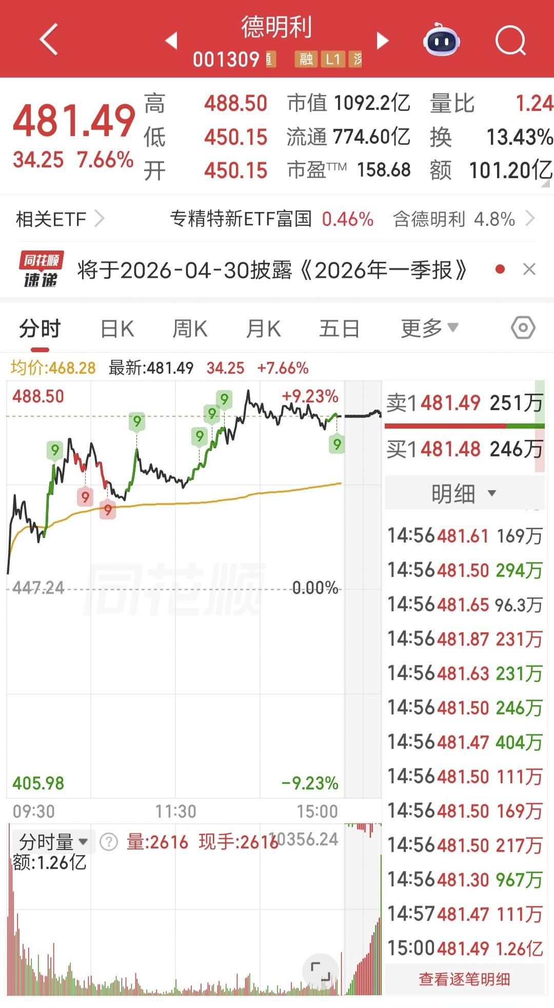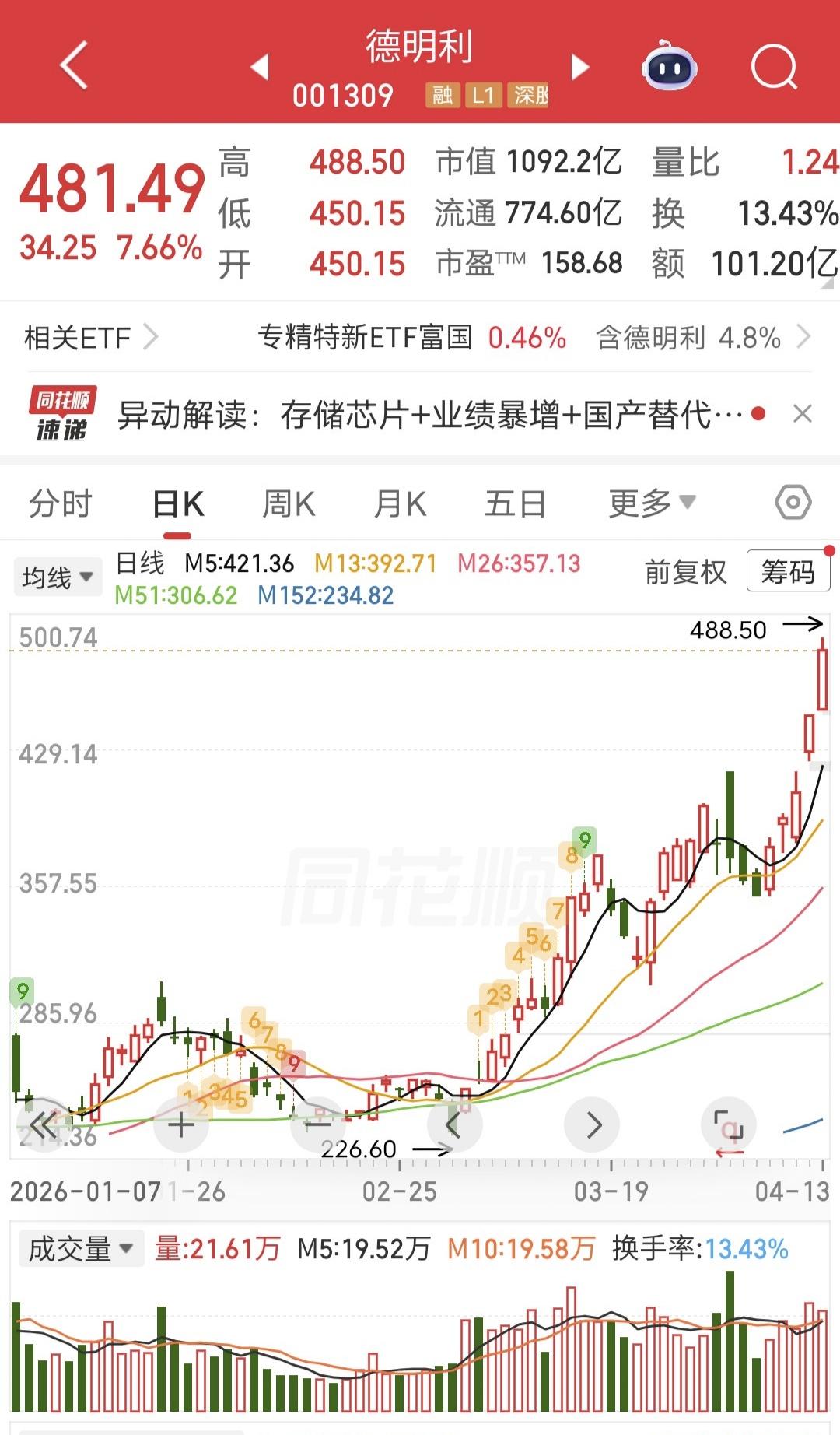 今天德明利强势上涨。