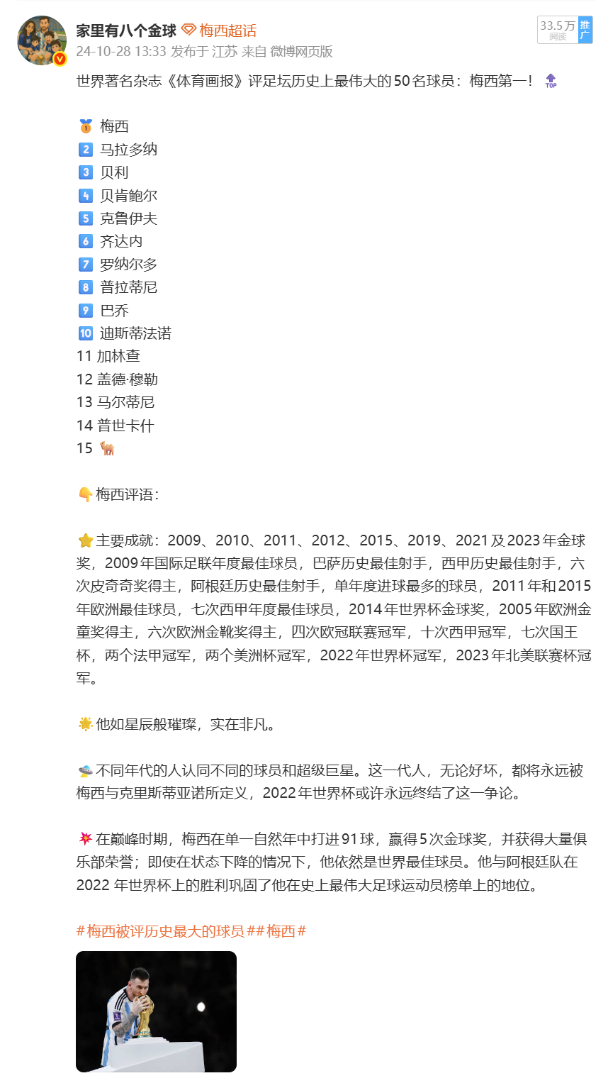 《体育画报》评选历史最伟大球员榜单原文:网页链接 ;梅西都评语如图5