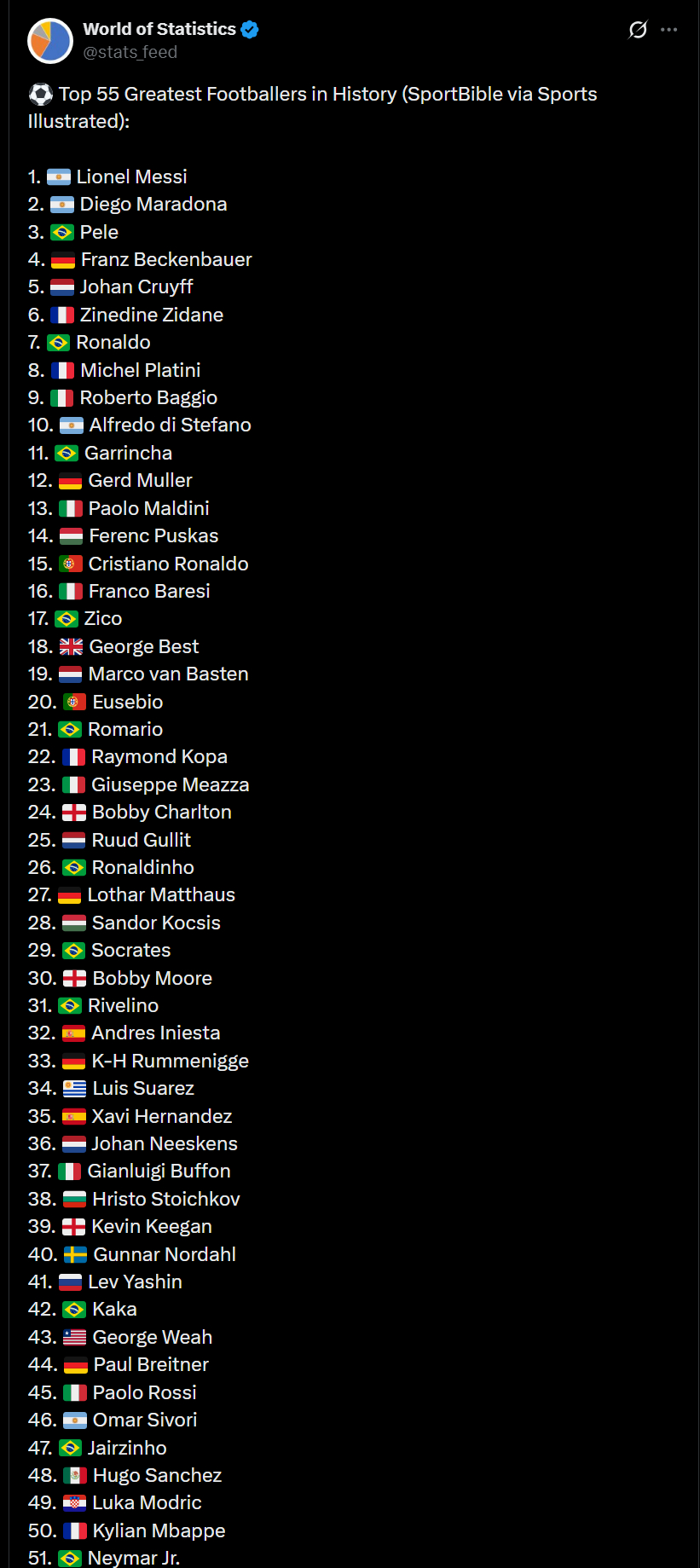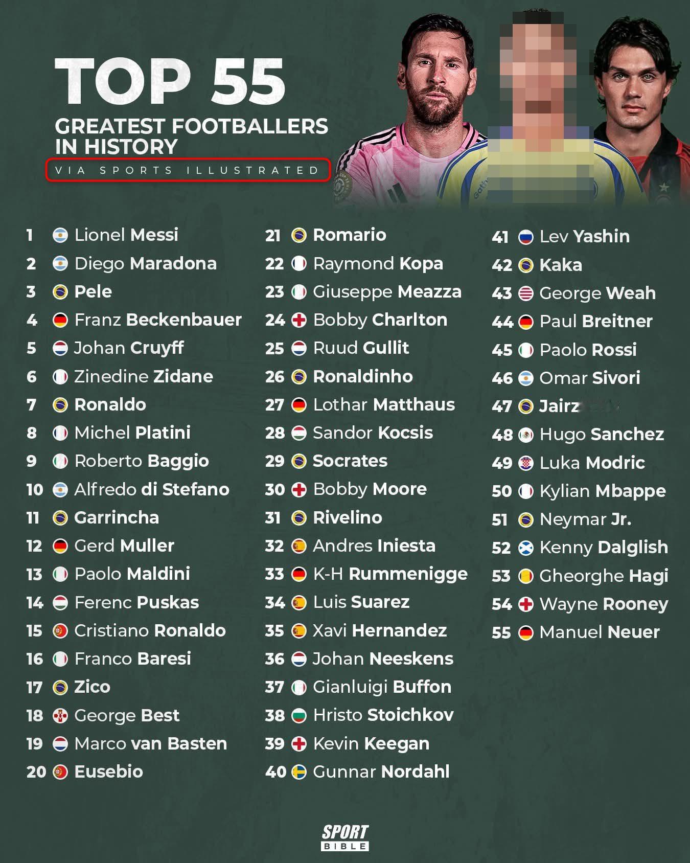 近期那张历史最佳球员排名的图,其实出处是《体育画报》在2024年评选的足坛历史最伟大的球员榜单。