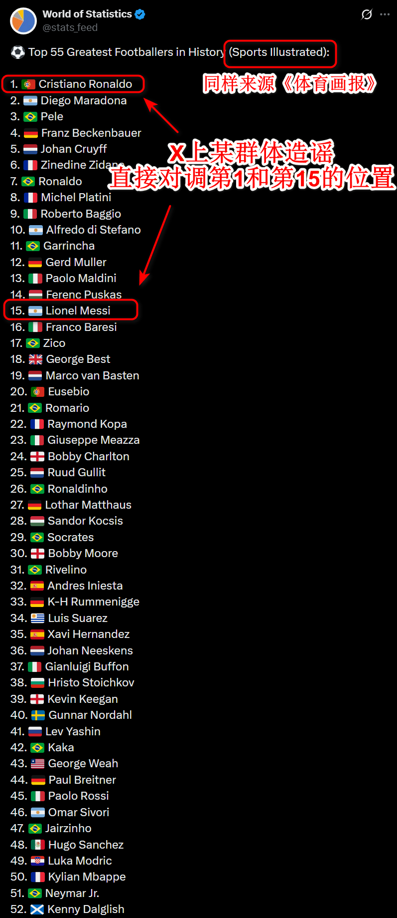 虽说SportBible转载的时候在原图中已经标注了来源,但它们照样能造谣,直接对调第1和第15的位置。这也直接误导了X上一个拥有500万粉丝、专注做数据统计的账号,不过被网友指正后,那份假榜单现在已经删了。