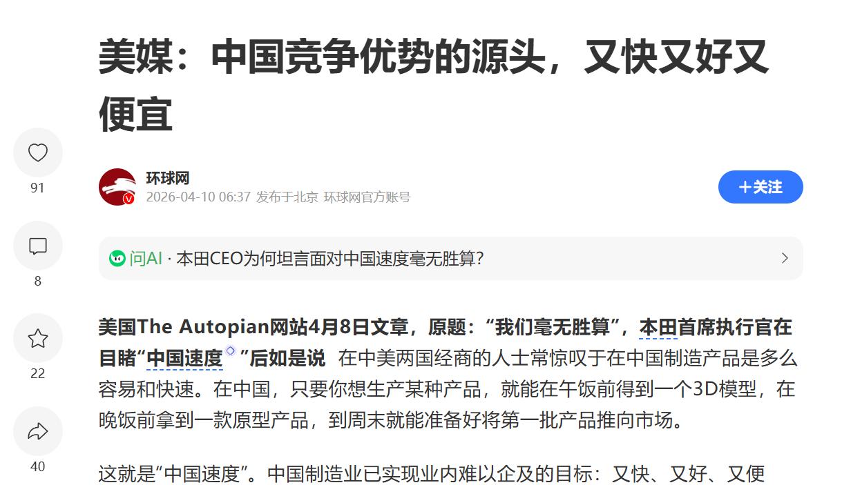 最近本田CEO参观完中国一家汽车零部件供应商工厂后,说出了这样一句话:“面对这样的实力,我们毫无胜算。”这话可不是自谦,工厂从零部件采购到物流管理,全流程自动化,劳动力成本低的同时质量还稳。他看到的,就是美媒所说的“中国速度”——又快、又好、又便宜。