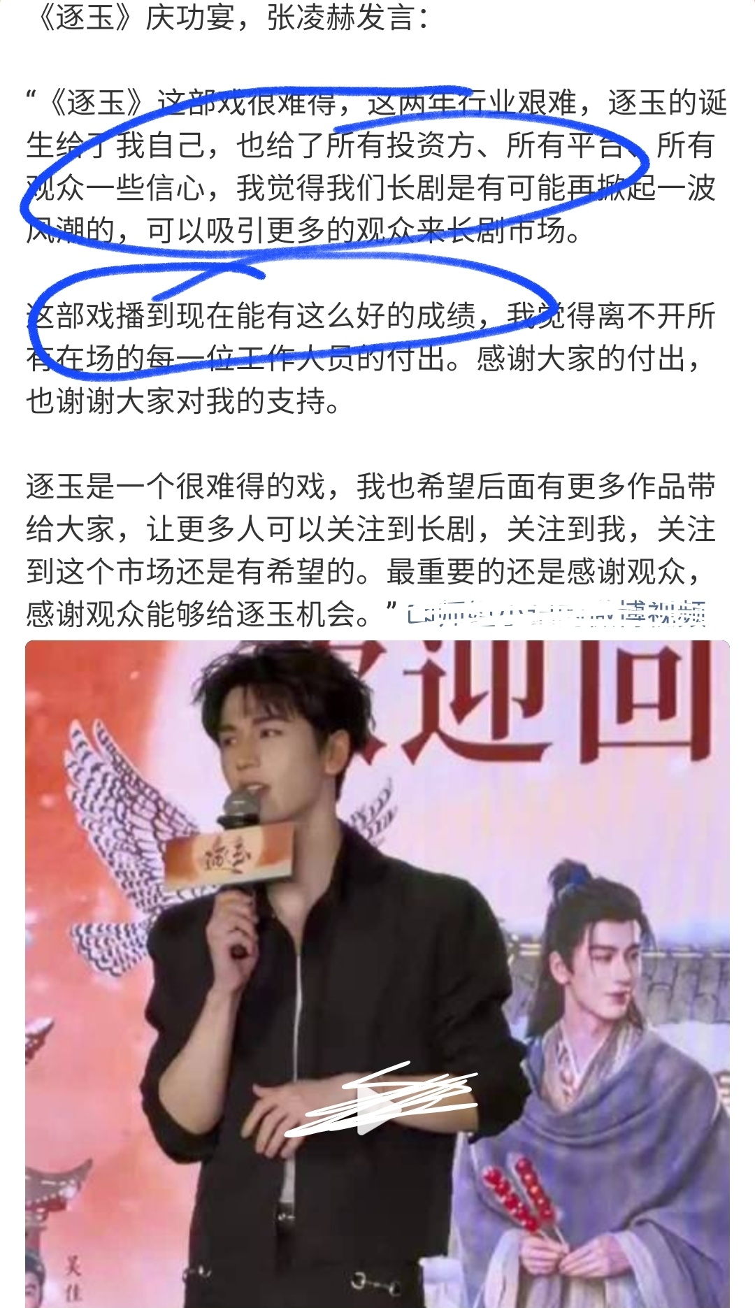 现场他穿一身简单的黑衬衫,没什么精致妆造,安安静静站在台上。一开始还努力稳着语气说长剧行业的艰难,可说到 “《逐玉》不仅给了我信心,也给整个长剧市场带来了希望” 的时候,声音直接卡壳了。