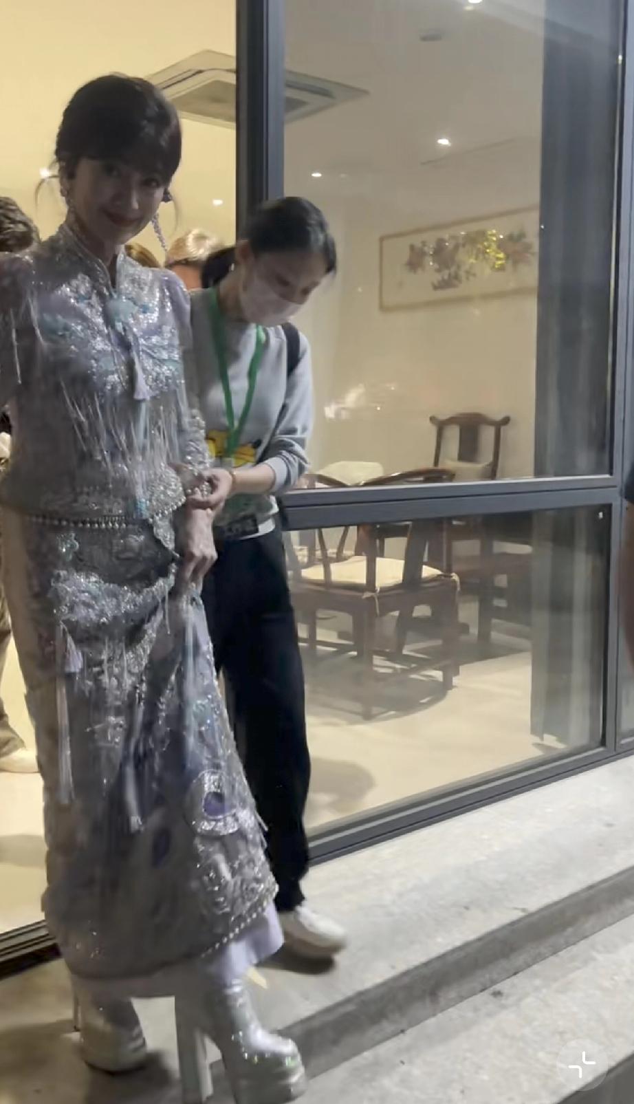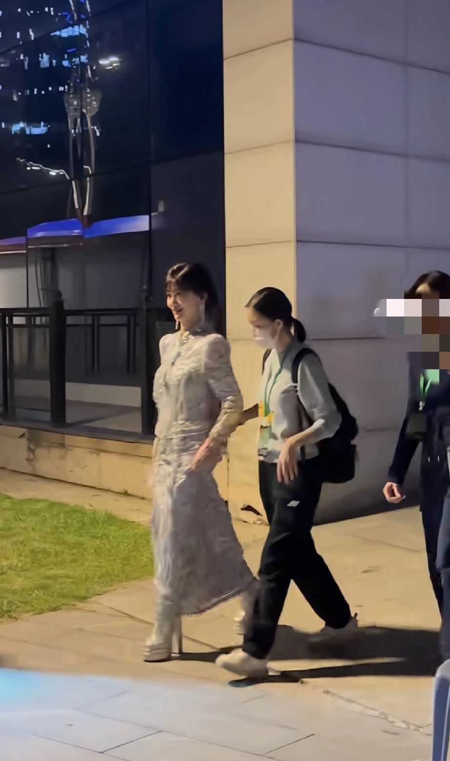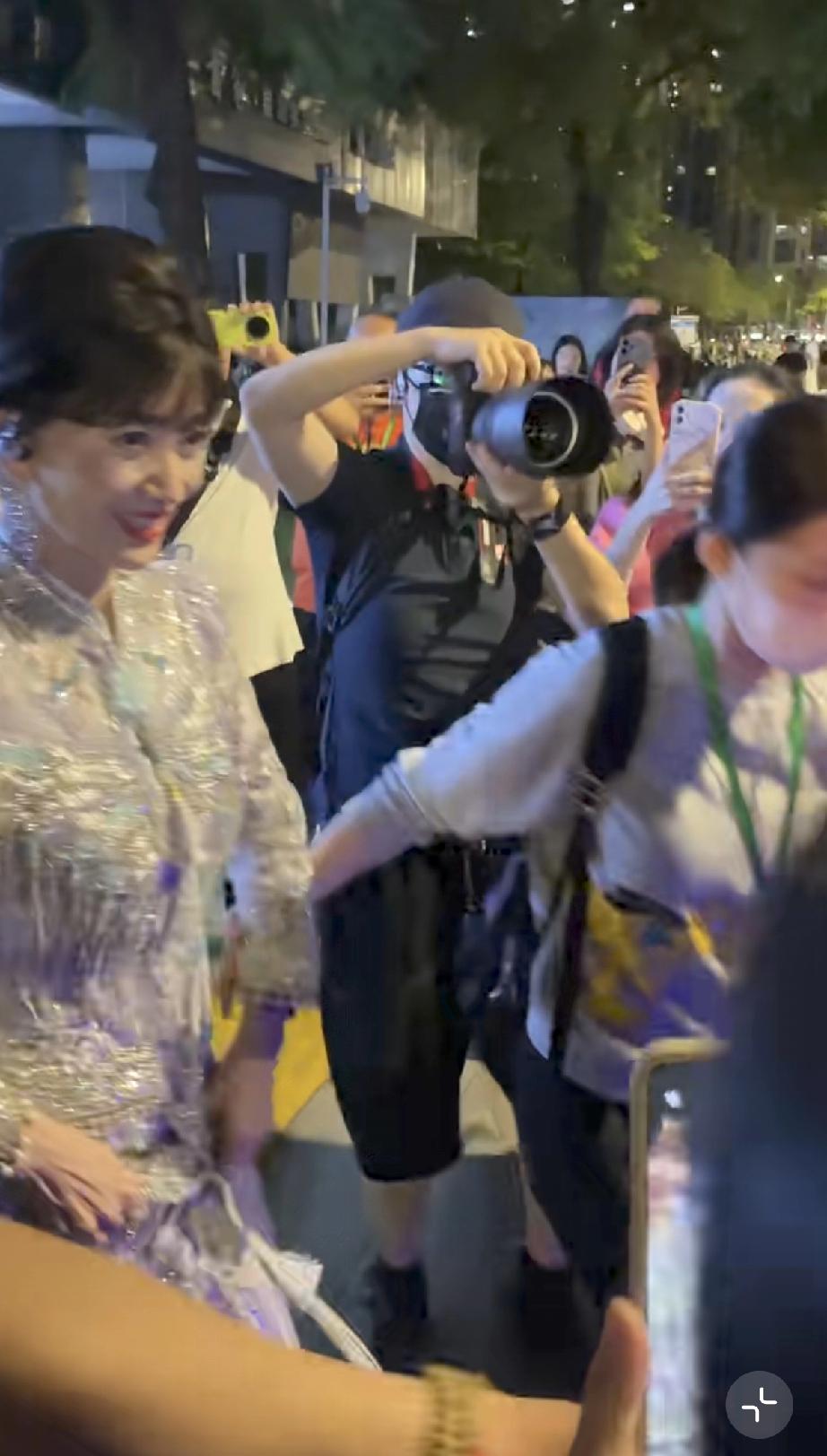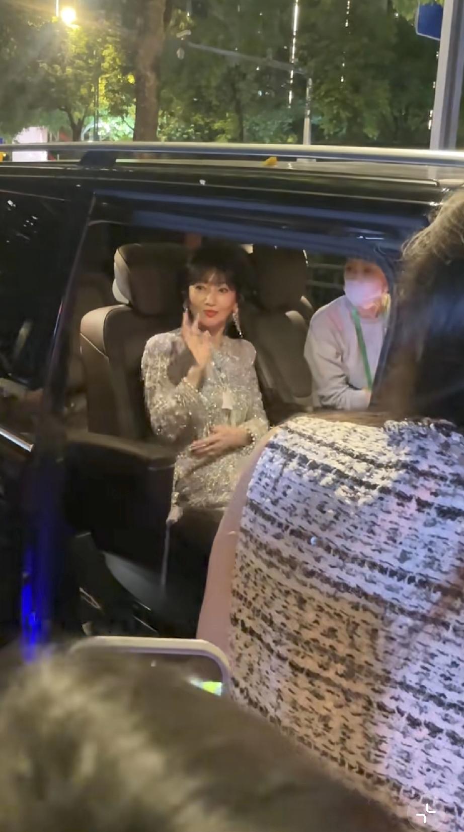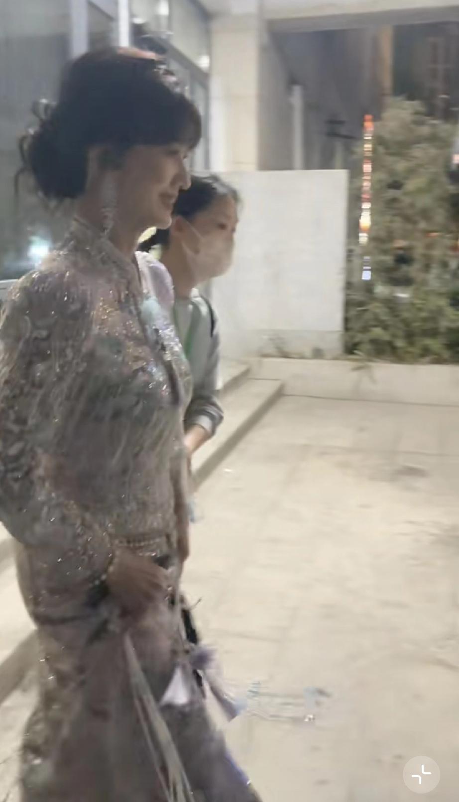 她晚上10点多了才出来,走路得有人搀扶,胳膊看着不是很舒服,她伸手跟路人打招呼,手背青筋爆出。