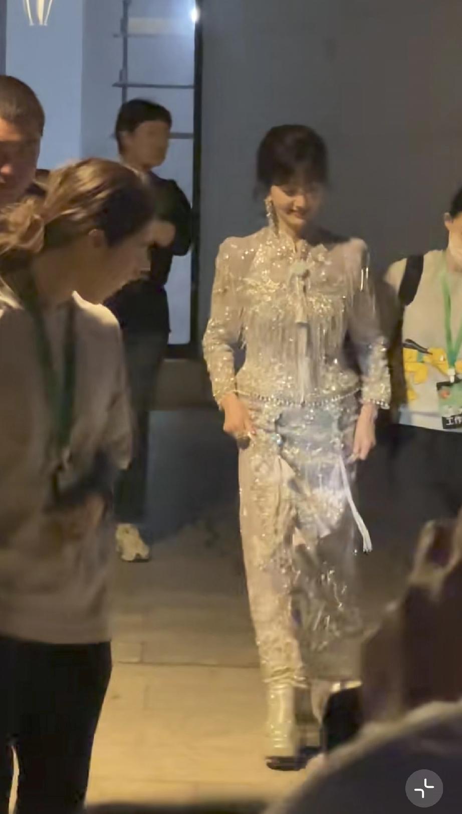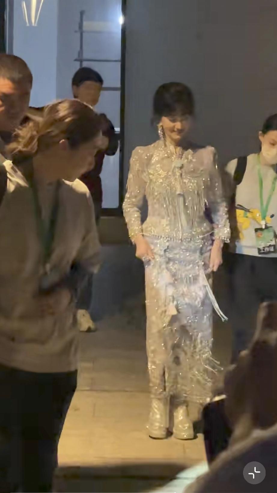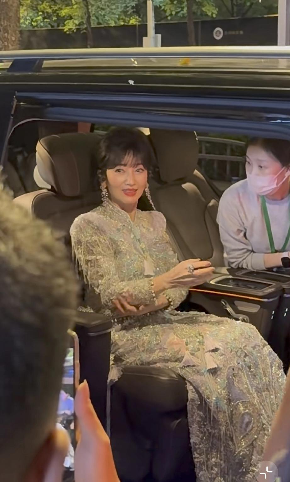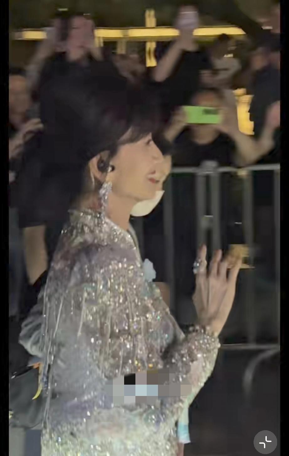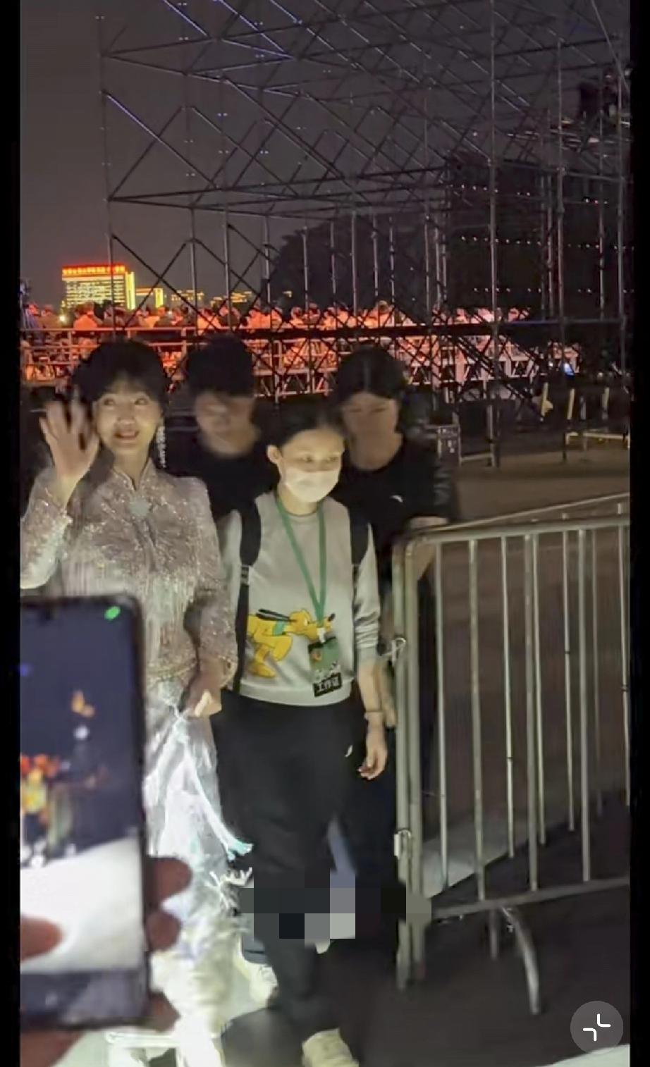她晚上10点多了才出来,走路得有人搀扶,胳膊看着不是很舒服,她伸手跟路人打招呼,手背青筋爆出。
