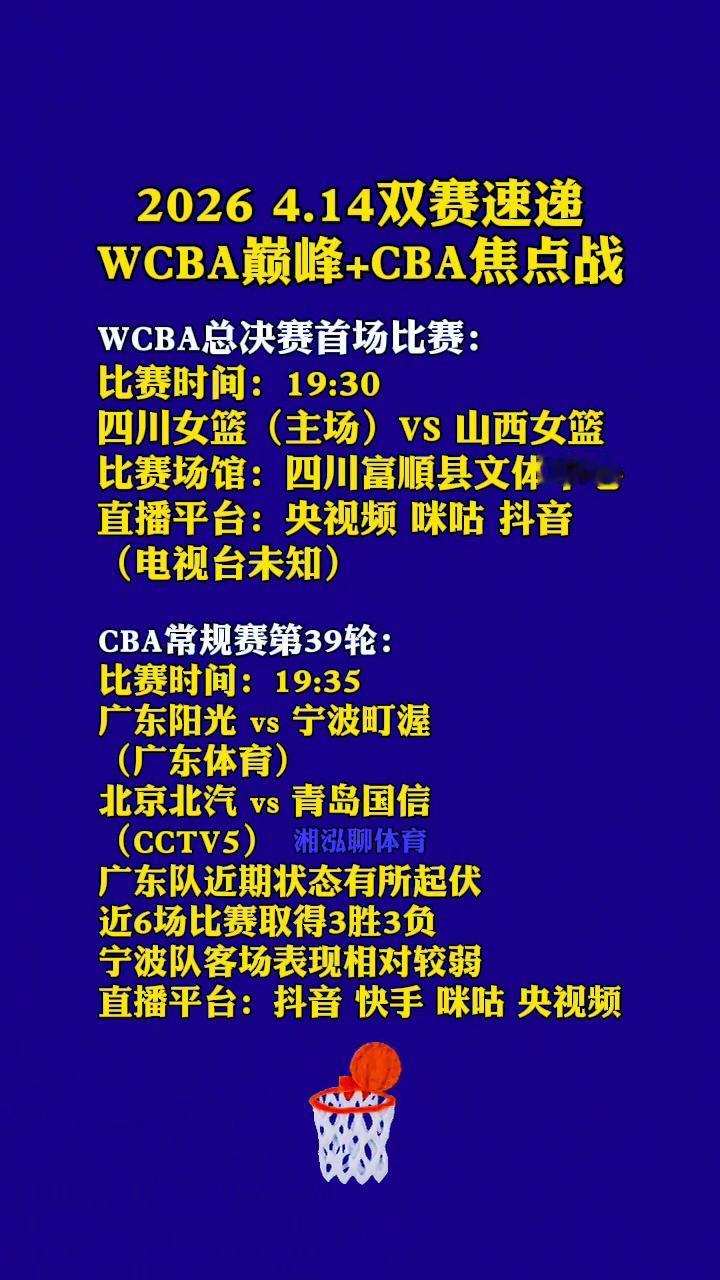 20264.14双赛速递:WCBA巅峰+CBA焦点战。 ·WCBA总决赛首场比赛