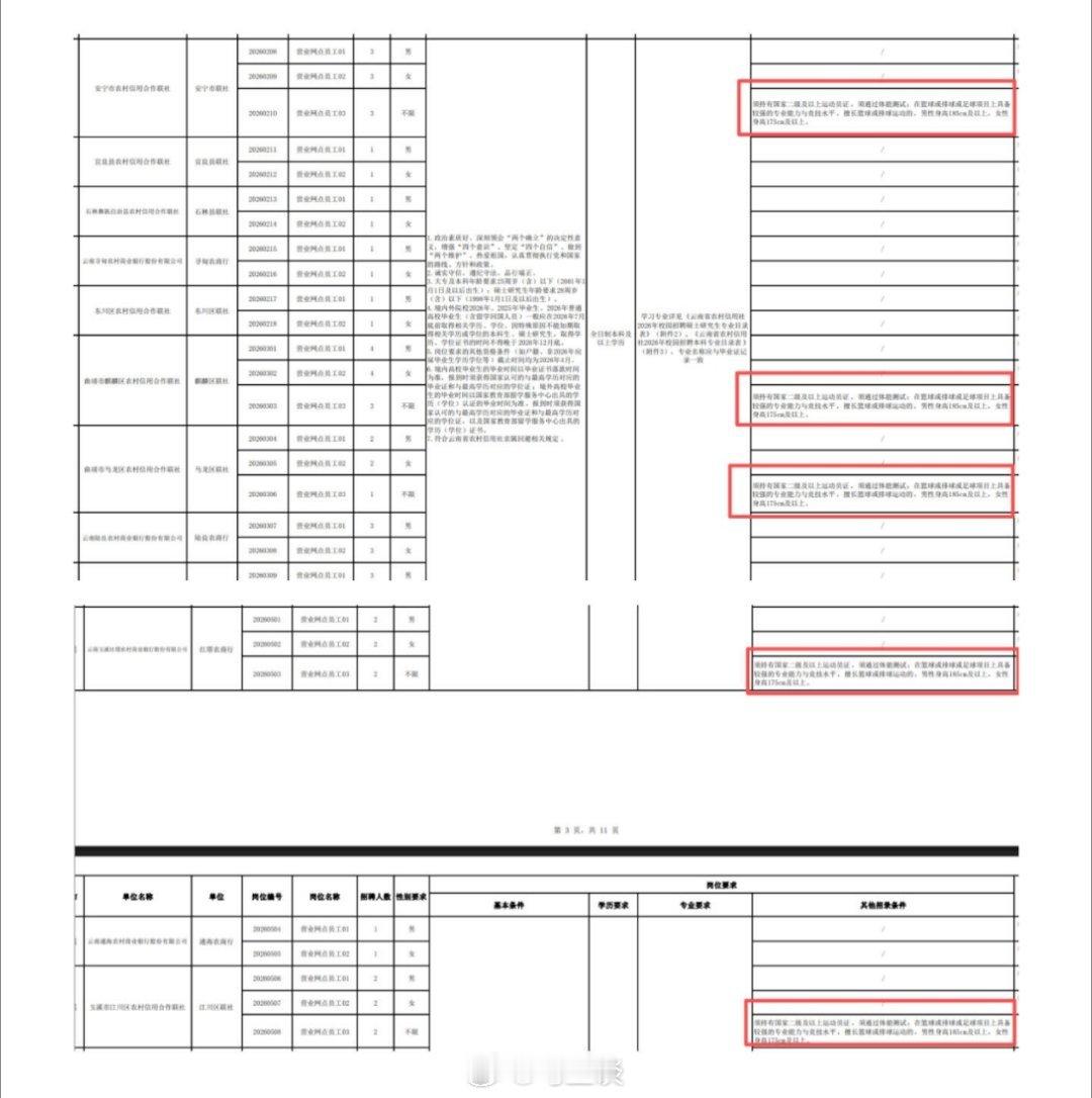 又见萝卜岗?云南一银行网点招聘硕士叠加运动员、一米八,被质疑是萝卜招聘…2026年云南农信社校招中,多家机构网点岗位叠加“硕士+二级运动员+男185cm/女175cm”等苛刻条件,全国算下来符合者仅数百人,被指是“萝卜岗”…