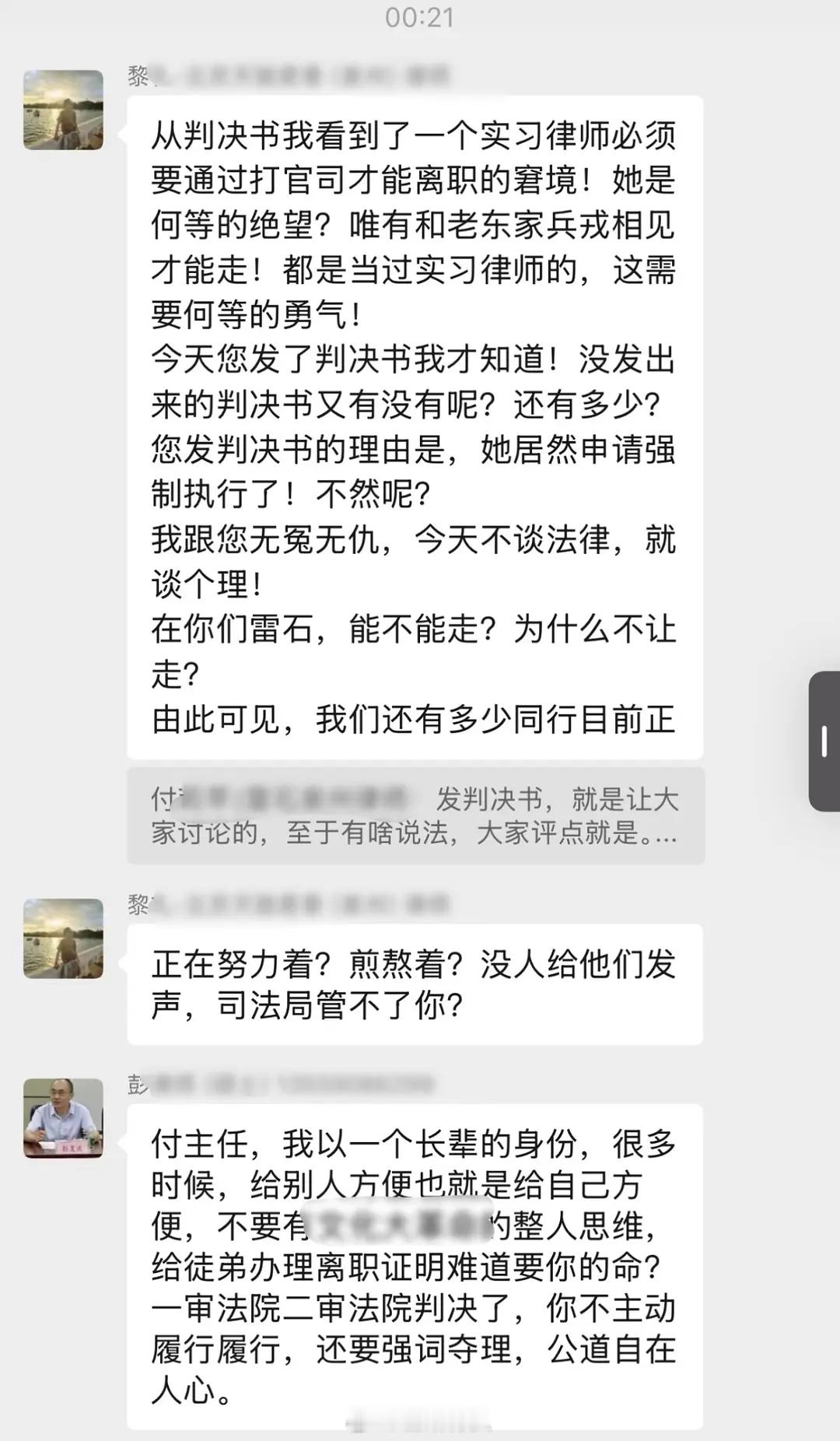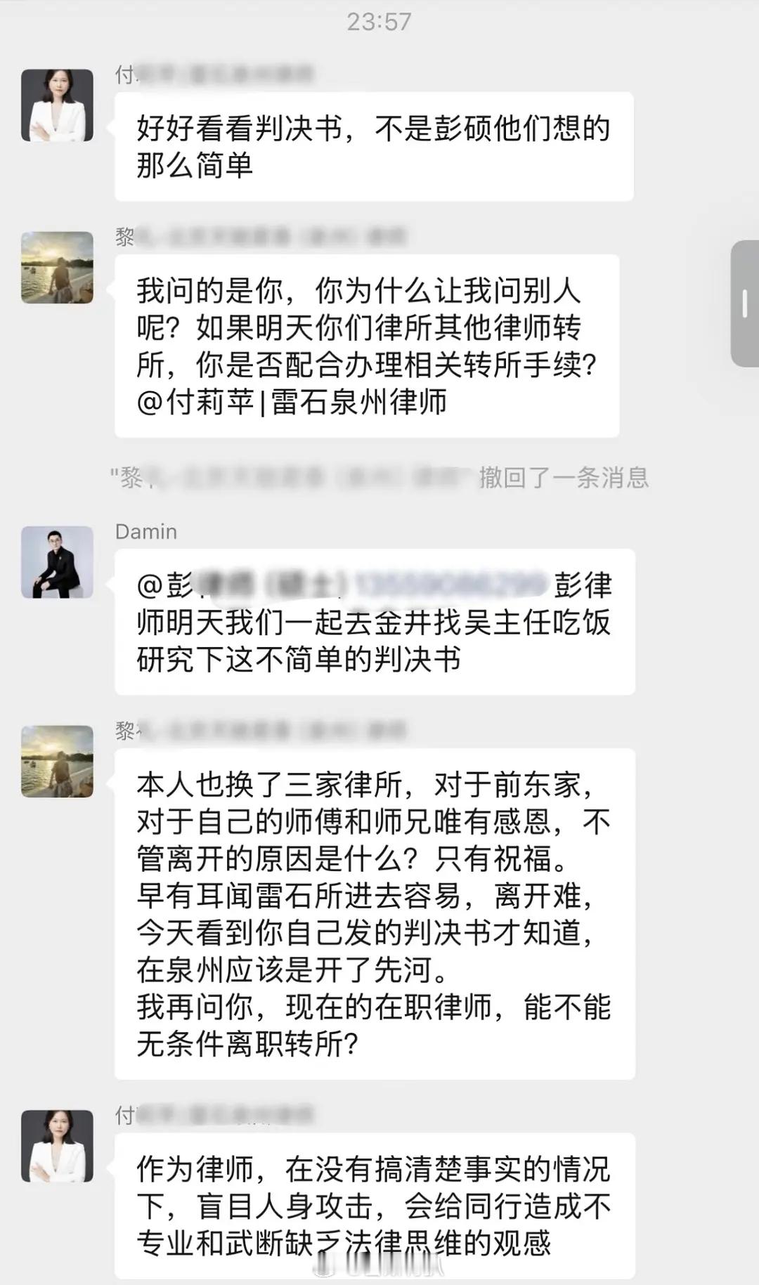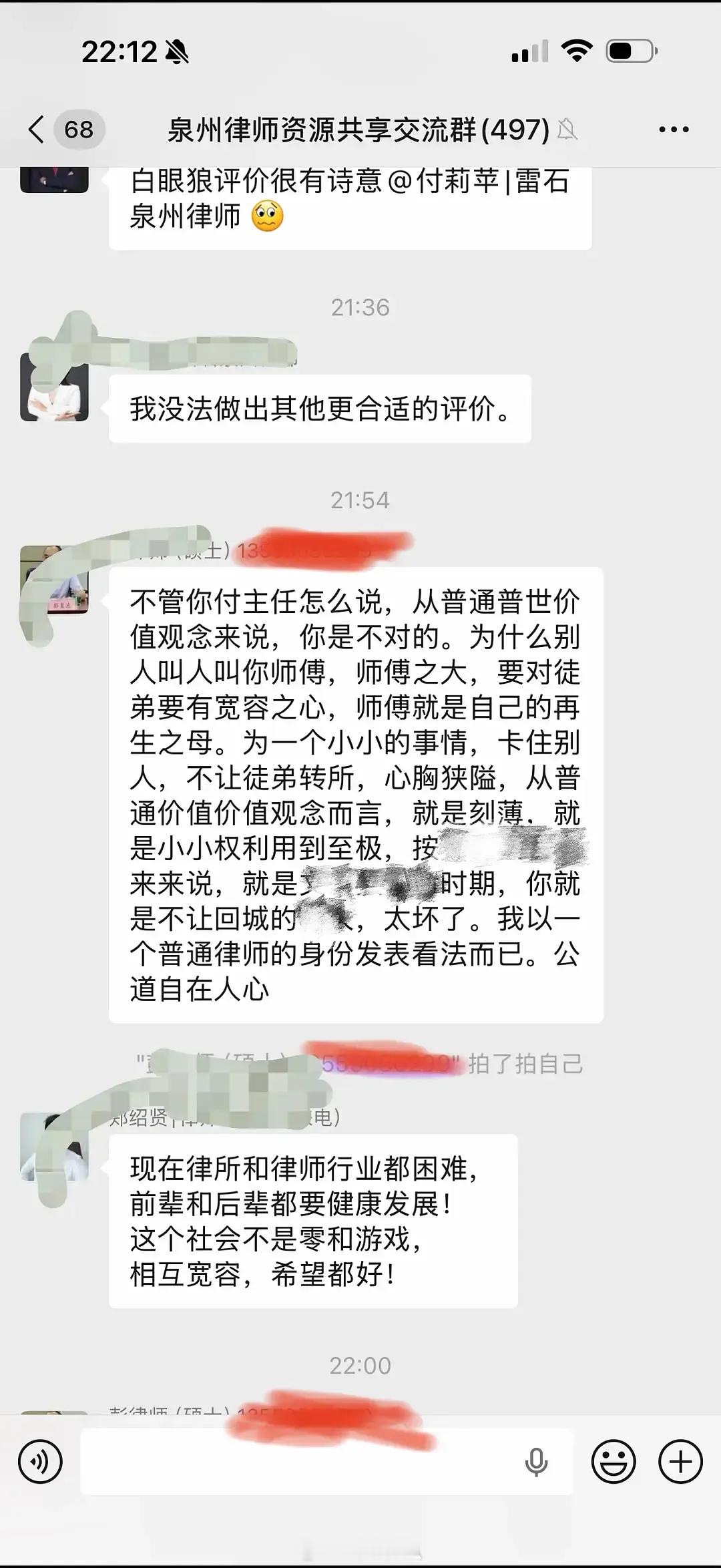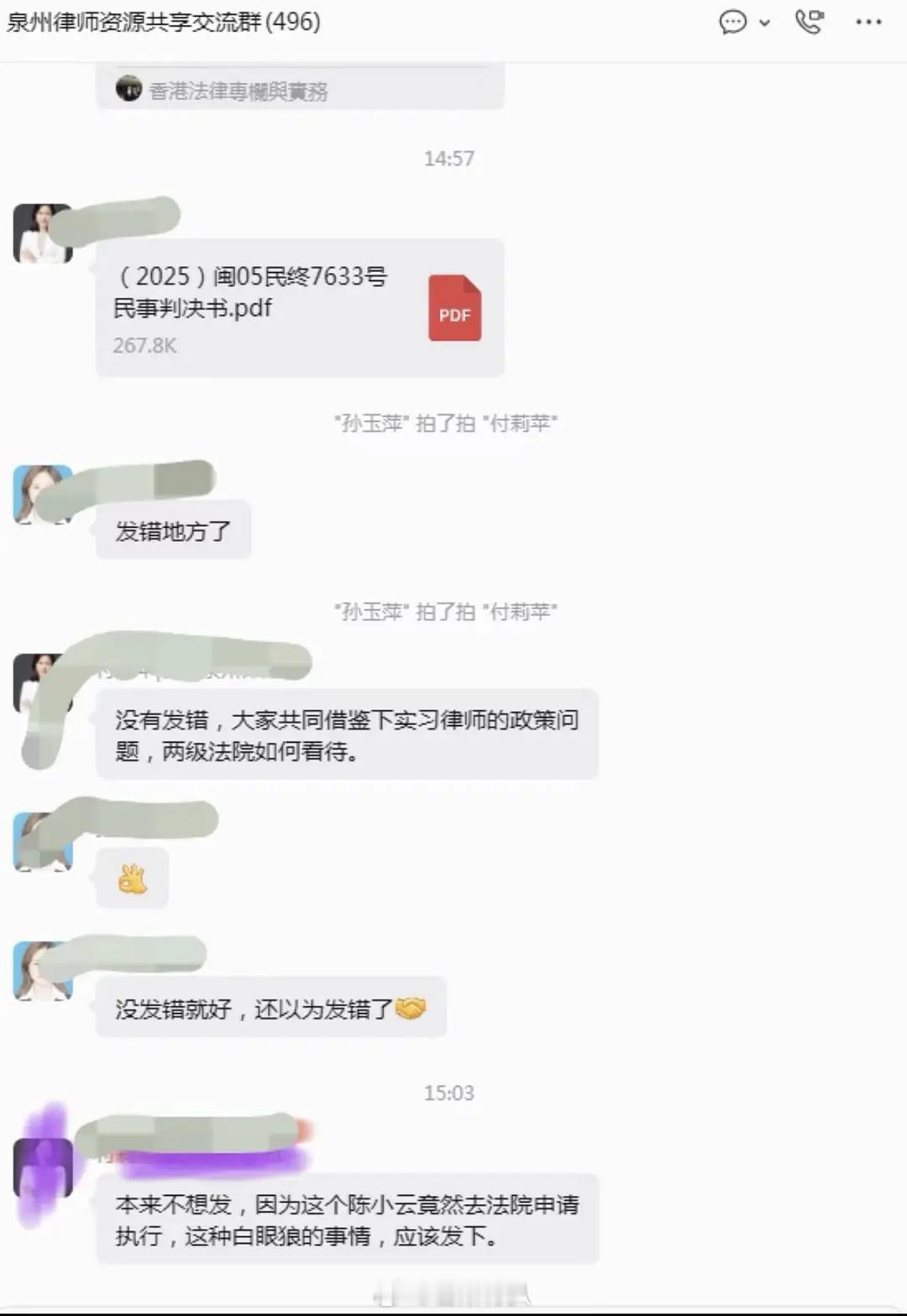 有人吃了泉州律所群的瓜吗?🍠刷到的,就是说一个泉州的律所卡一个实习律师不让她离职,这个实习律师也很硬气直接状告他们律所,二审都胜诉了。这个律所的一个律师心怀不满,直接把判决文书发到了群里还称那个实习律师是白眼狼,本意是寻求认同or行业封杀。没想到被同行接连炮轰。不愧是律师,他们说话太有意思了。