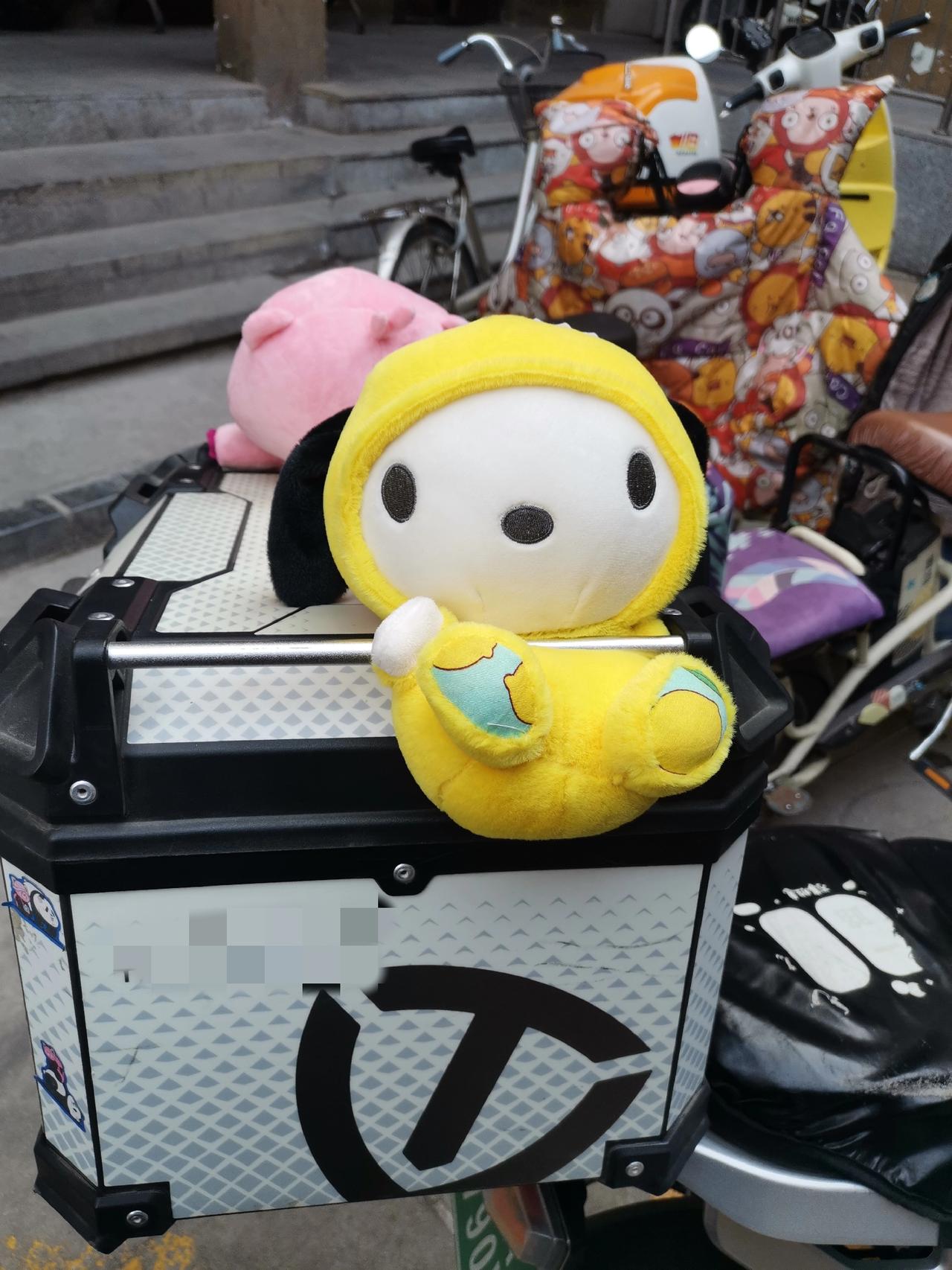 下楼时正好遇到外卖小哥来送外卖,忽然发现他的电动车上还挂着这样可爱的玩具!真是意外而且惊喜啊!