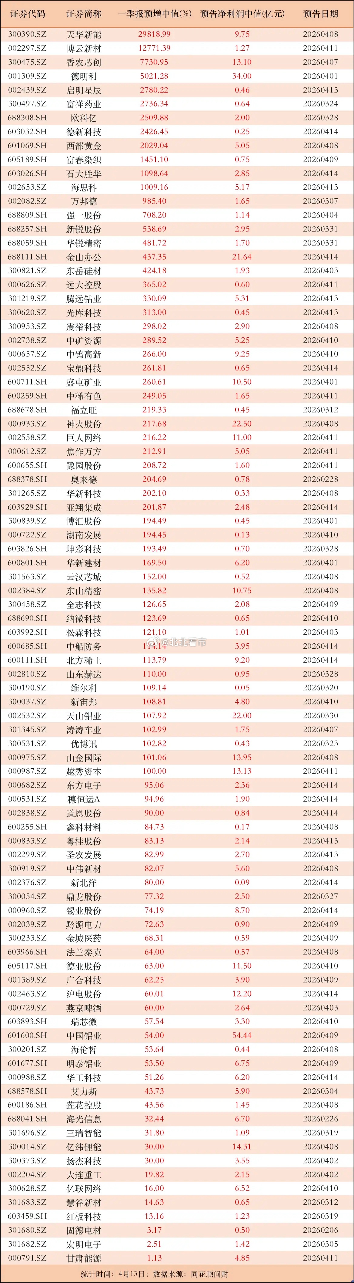 新一周开始,又有部分公司披露一季报业绩预增。截至4月13日,沪深两市一季报业绩预增的公司数量,已经接近100家了。如果不含未上市的新股,则有89家了。