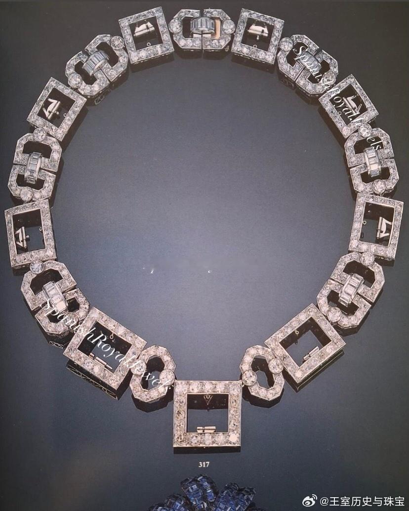 珠宝 已故第18代西班牙阿尔巴女公爵卡耶塔娜·菲茨-詹姆斯·斯图亚特的祖母绿钻石项链,由9颗硕大的方形祖母绿作为主石,另有一枚镶嵌着椭圆形祖母绿的吊坠,主要是由老式切割镂空矩形钻石配件组成,配件呈渐变排列,并以圆形、长方形和老式切割钻石灵活连接,形成类似搭扣的交错结构,不仅项链配有隐藏式吊坠环,而且矩形配件上预留了镶嵌宝石的底座,方便使用拆卸。