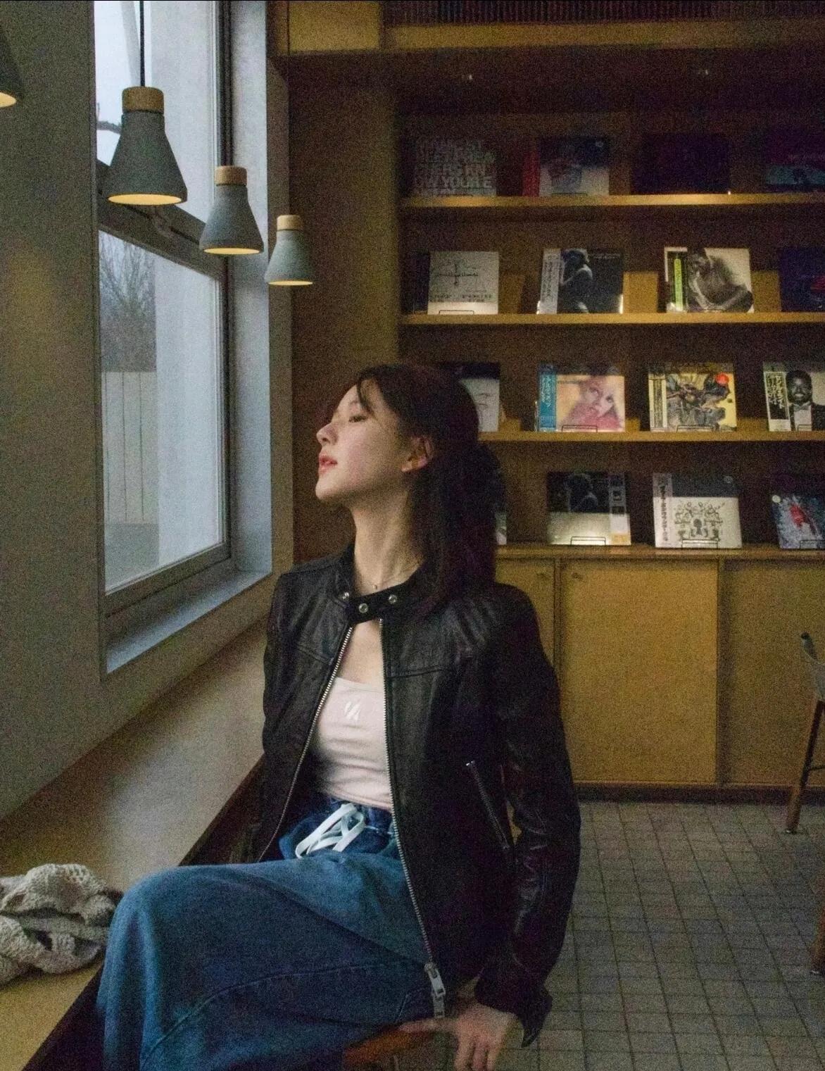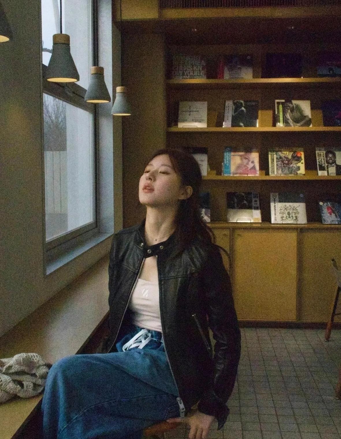 赵露思这套真的好抄!短款机车皮衣+宽松直筒牛仔,上紧下松的黄金比例。内搭白T提亮
