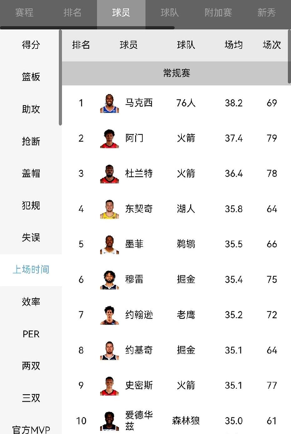 阿门·汤普森总出战2954分钟,排联盟第一。37岁的杜兰特总出战2841分钟,是他10年来出战最多的赛季。小贾巴里·史密斯列联盟第四。