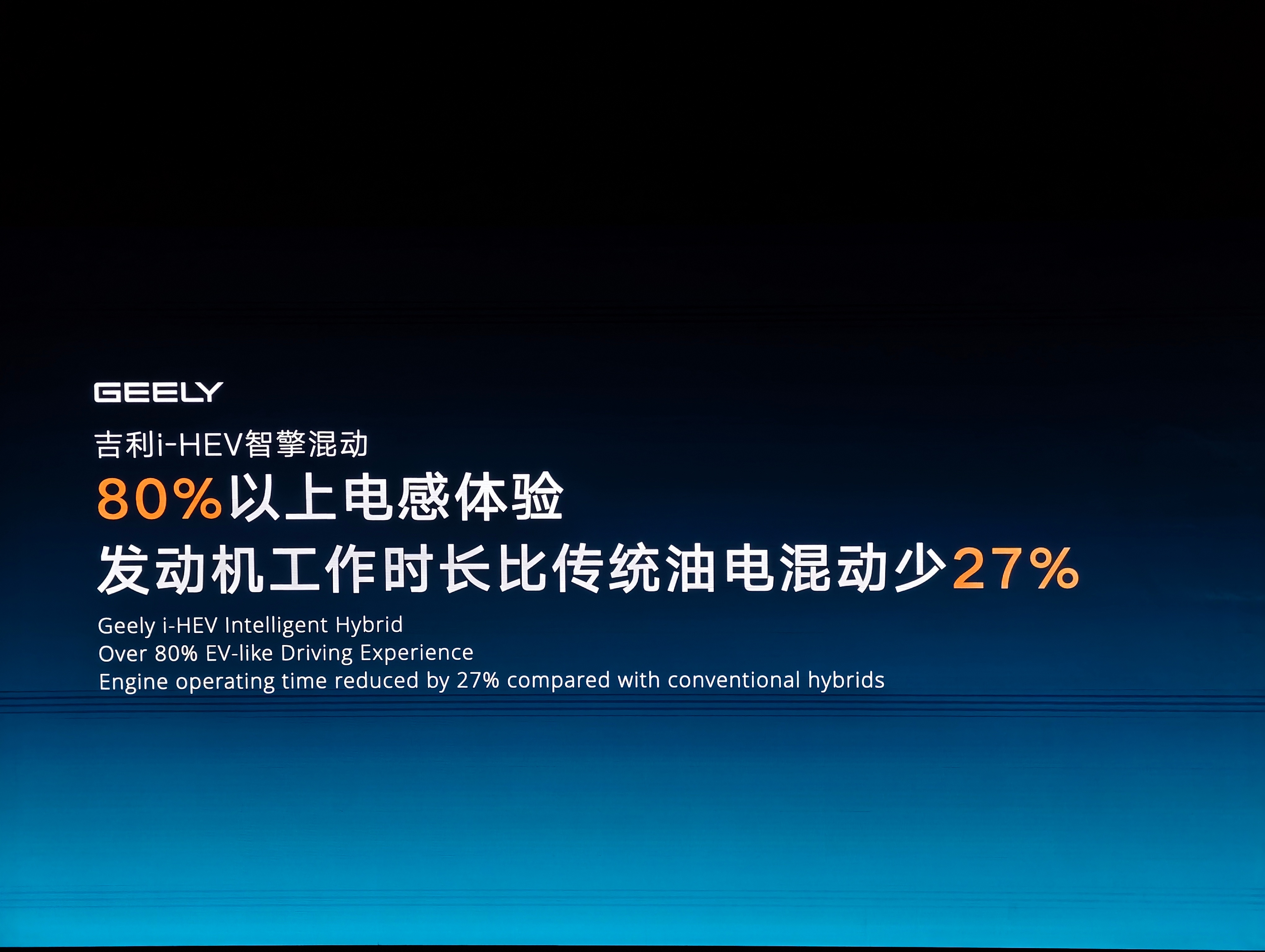 吉利正式发布全新i-HEV智擎混动技术,以AI驱动的三擎架构,带来更接近纯电的驾驶体验——发动机工作时长降低27%,纯电场景占比超80%。