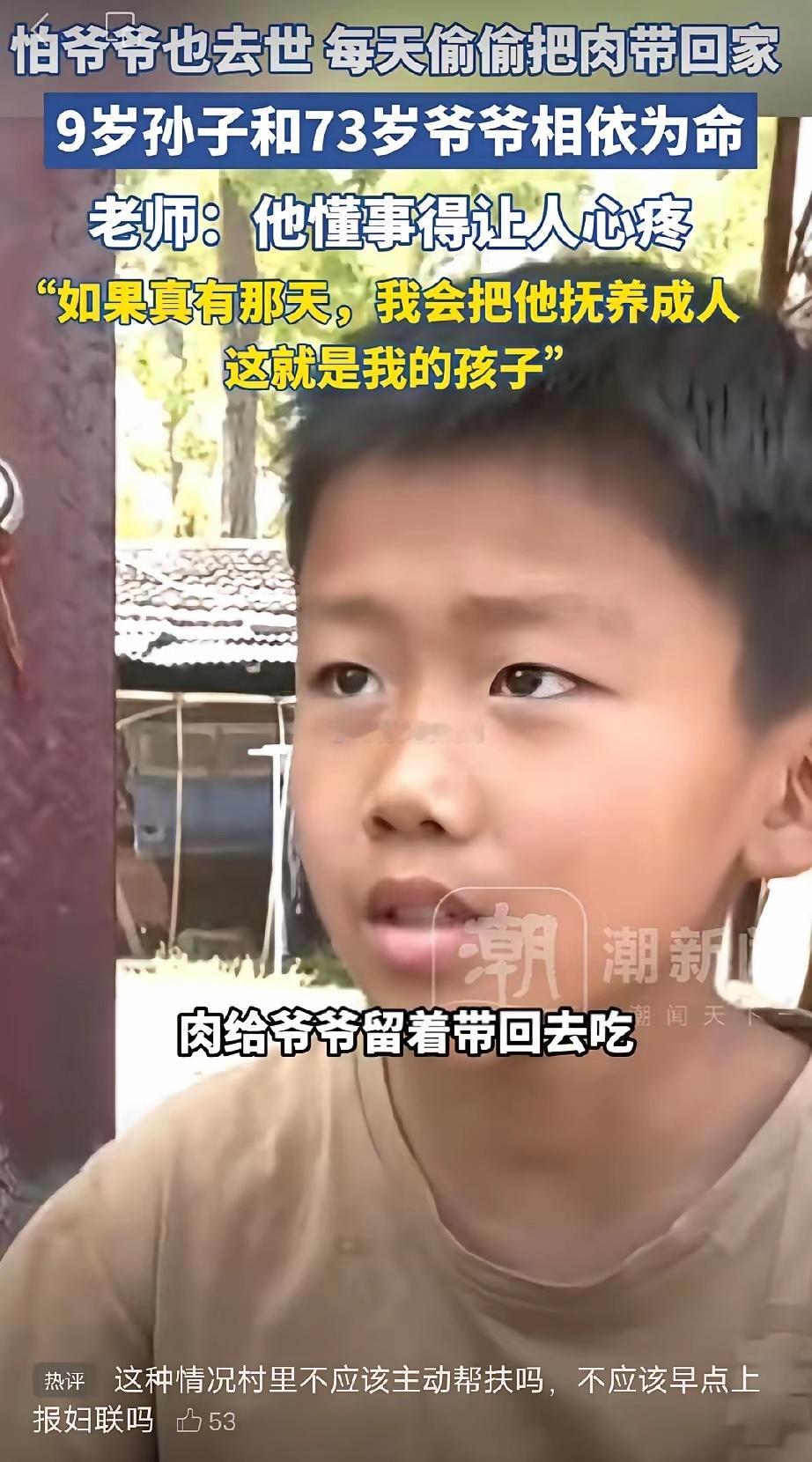 暖哭了!河南周口,女子在看学生吃午饭,一男孩偷偷拿了个塑料袋把肉装起来,鬼鬼祟祟的,女子觉得奇怪,赶紧问男孩,这是要做什么?男孩眼神躲闪,有些胆怯地说道:“肉先不吃,给爷爷留着,他一个人在家不舍得吃这么好吃的。女子听完瞬间泪目,而男孩的遭遇更是让众多网友哽咽。这个男孩名叫晨晨,今年9岁,是河南周口某小学三年级的学生,中午学生们都在学校统一吃饭。这天,一名老师在给孩子们发饭,老师发完饭,她注意到,一个男孩子只吃了碗里的青菜和白米饭,而碗里的肉,他却拿个塑料袋打包起来。女子觉得很奇怪,不明白男孩为什么要这么做,为了弄清楚,老师走过去,温柔地问男孩:“你为什么不吃肉,为何塑料袋打包呀?”男孩看到老师发现了自己的所作所为,他担心老师不给打包回家,瞬间就有些胆怯了,他小小声地回道:“这些肉我打算不吃了,留回去给爷爷了,他一个人在家,不舍得吃这么好吃的”老师听完,瞬间泪目,她不知道这个男孩身上到底发生了什么事,就单纯的,男孩对爷爷的这份敬重和惦念,就让老师觉得,这个孩子是那么懂事和孝顺。事后,老师了解到,男孩的父亲在他很小的时候就过世了,父亲走后不久,男孩母亲离开家,另嫁他人,前两年孩子的奶奶也过世了。如今,男孩跟爷爷相依为命,爷爷身体不好,平时就靠种点菜拿去卖了维持祖孙的生活。为了节省开支,他们常常十天半个月才吃上一次肉。爷爷身体不好,男孩为了让爷爷多休息,家里的活他自己能干的,都尽量帮爷爷做,洗衣做饭,甚至放学回来的路上都捡瓶子拿去卖贴补爷爷。老师在了解完所有情况后,特意联系上晨晨的爷爷,看着老人瘦弱又操劳的样子,心里满是不忍。她郑重地对爷爷说:“您放心,以后孩子在学校有我照看着,有我一口吃的,就绝不会让孩子受委屈。就算以后有什么事,我也会把晨晨当成自己的孩子,好好供他读书,把他抚养成人。”爷爷听后满眼泪水,紧紧握着老师的手,激动得说不出话来。这份沉甸甸的承诺,让不少人为之动容。大家既心疼晨晨过早扛起生活的重担,也感动于老师的善良与担当。如今有了学校的补助、老师的照料和社会各界的关心,爷孙俩的生活渐渐有了起色。晨晨依旧懂事孝顺,用小小的行动温暖着爷爷,也被身边的温柔好好守护着。愿这对苦命又暖心的爷孙,往后少些风雨,多些安康,日子越过越有盼头。这件事被发到网上后,很快就冲上了热搜,无数网友看得眼眶发红。大家都被这个九岁孩子的孝心深深打动,评论区里满是心疼与祝福,很多人都说,这么小的年纪就懂得感恩和担当,实在太难得了。不少爱心人士看到消息后,主动联系学校和当地社区,想要为晨晨和爷爷提供帮助。有人送去了米面粮油、棉衣棉被,有人捐了善款,希望能改善他们的生活,让爷爷安心养病,也让晨晨能安心读书。面对大家的善意,晨晨和爷爷都十分感激。爷爷握着好心人的手不停道谢,晨晨也默默记在心里,更加努力学习,也更用心地照顾爷爷。生活虽然曾经布满艰辛,但这份来自四面八方的温暖,让爷孙俩看到了希望。相信在大家的守护下,晨晨会健康快乐地长大,用自己的方式回报这份善意,未来的日子也一定会越过越暖。