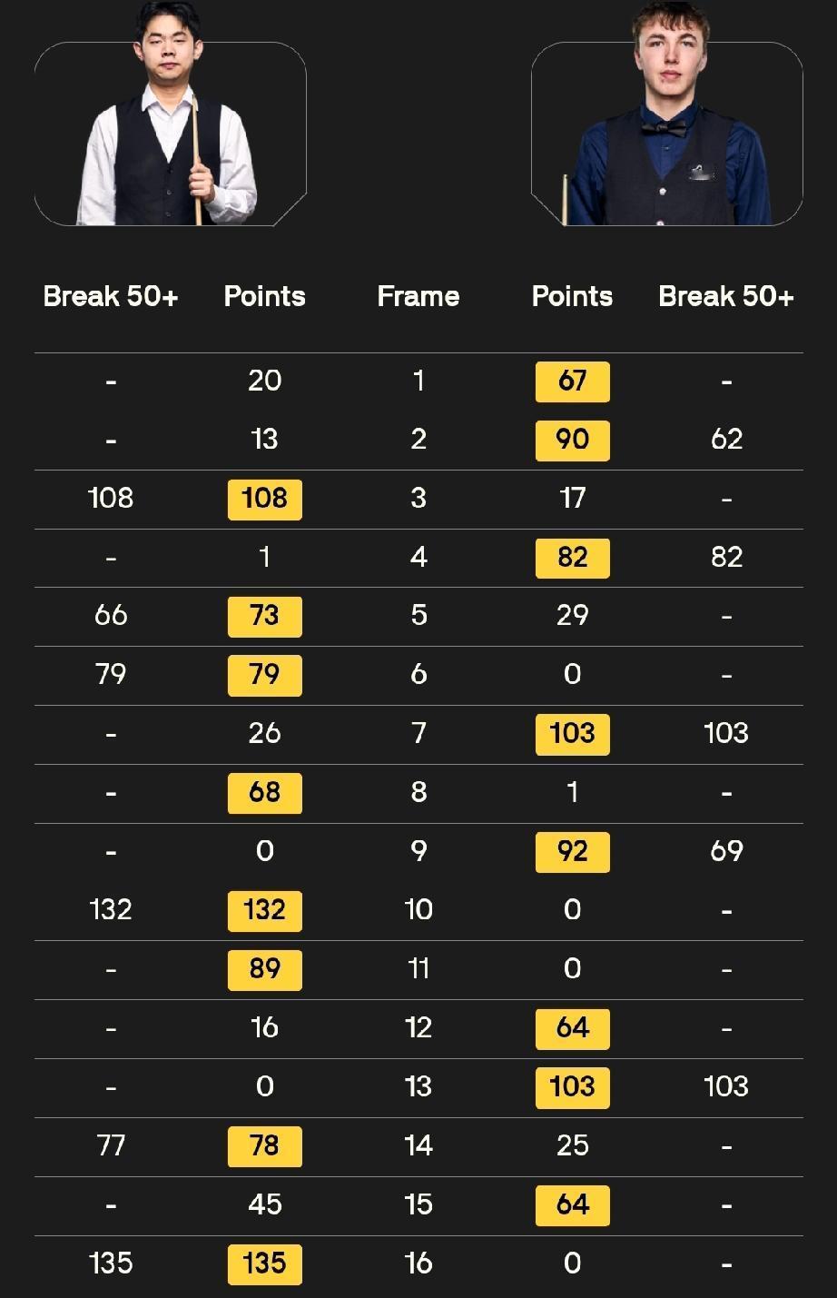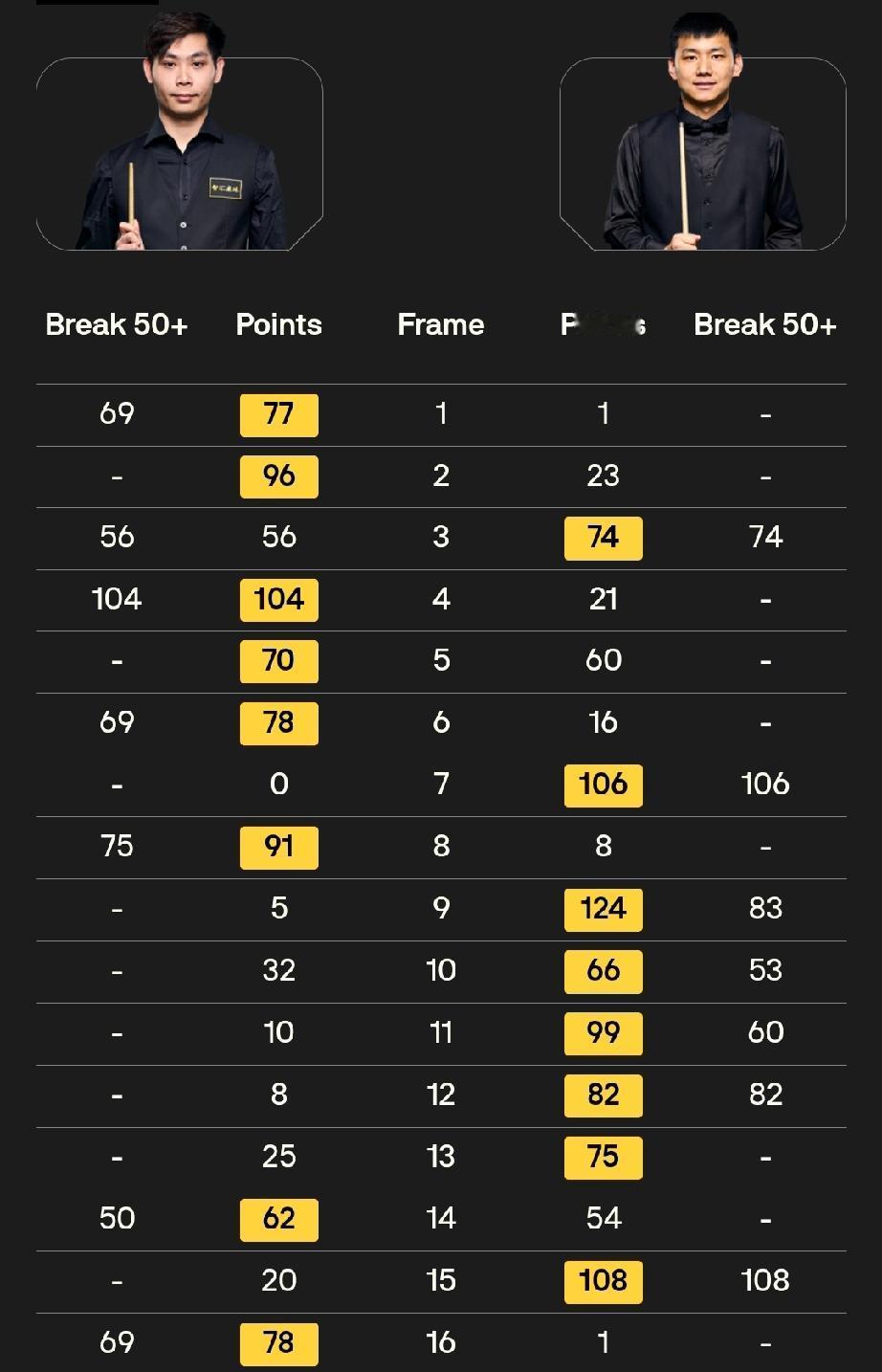 袁思俊打出三杆破百三杆50+,8-8战平本·默滕斯;贺国强8-8战平龙泽煌。