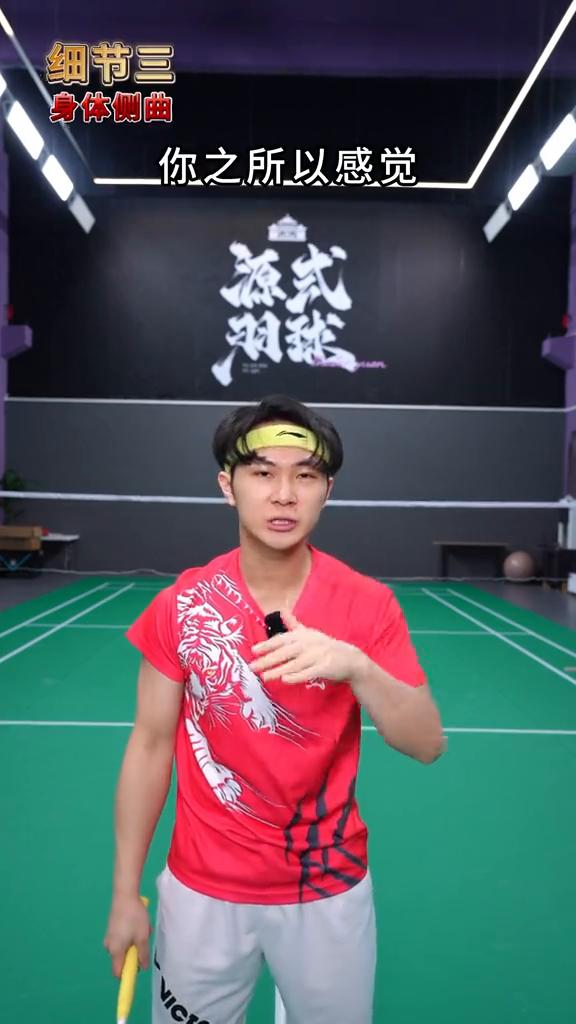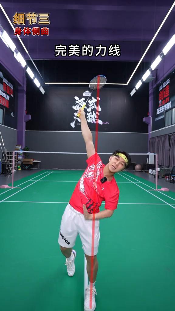 ·细节三:身体侧曲。你之所以感觉力量传导不通畅,没办法将力量爆发出去,都是因为你是身体站直了向前杀球。但是你要知道肩膀活动度是有限的,当你站直的时候手臂是自然往右上方去挥拍的,是很难拿到上面的这个点的。