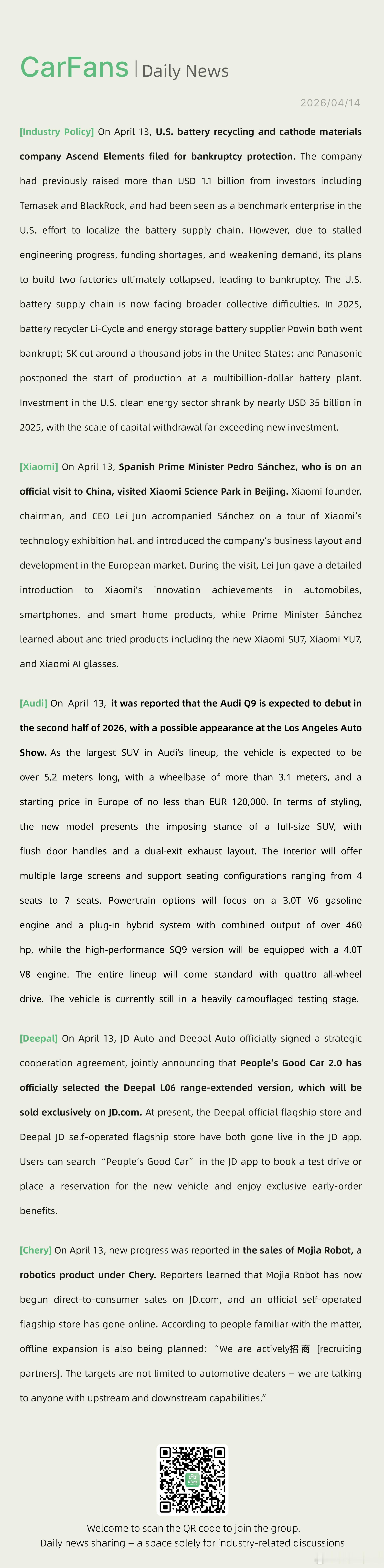 美国电池回收与正极材料企业申请破产西班牙首相桑切斯到访小米科技园正在中国进行正式