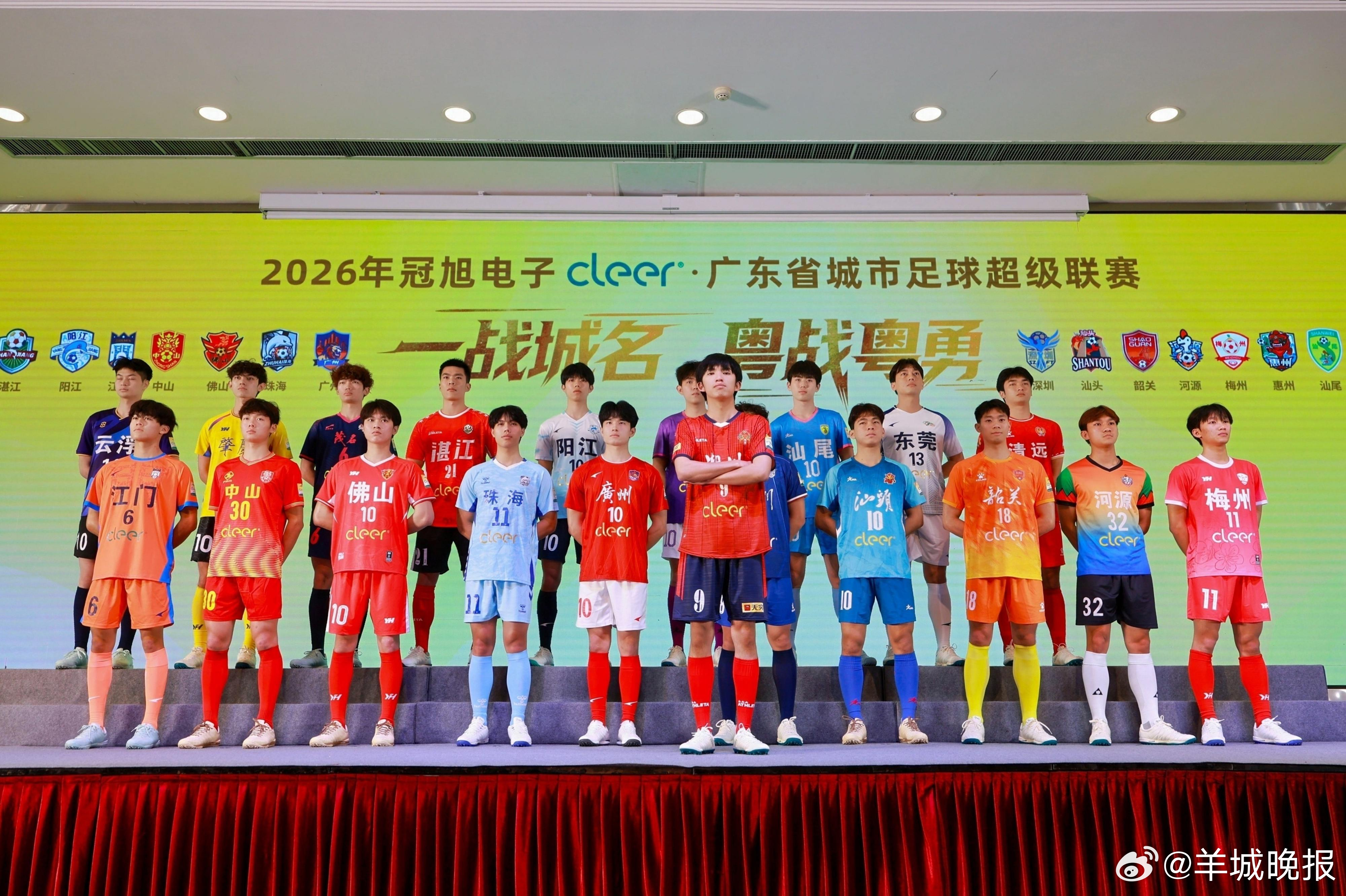 【#粤超21城战袍集齐赤橙黄青蓝紫为何独缺绿#?】4月13日,2026年广东省城市足球超级联赛新闻吹风会在广州举行,广东21个地市代表队比赛服闪亮登场。方寸球衣,藏一城风骨,上身即战袍,上场即荣光!21名“肌肉男”战袍加身,走起炫酷T台秀,将粤超仪式感拉满。放眼全场,赤、橙、黄、青、蓝、紫等各色球衣交相辉映,将岭南城市的多元气质和现代美学展现得淋漓尽致。而有细心的球迷发现,21支球队主场球衣色彩百花齐放,唯独不见绿色,这一趣味细节,也让21城球衣发布多了一层话题。