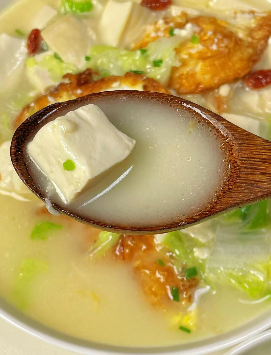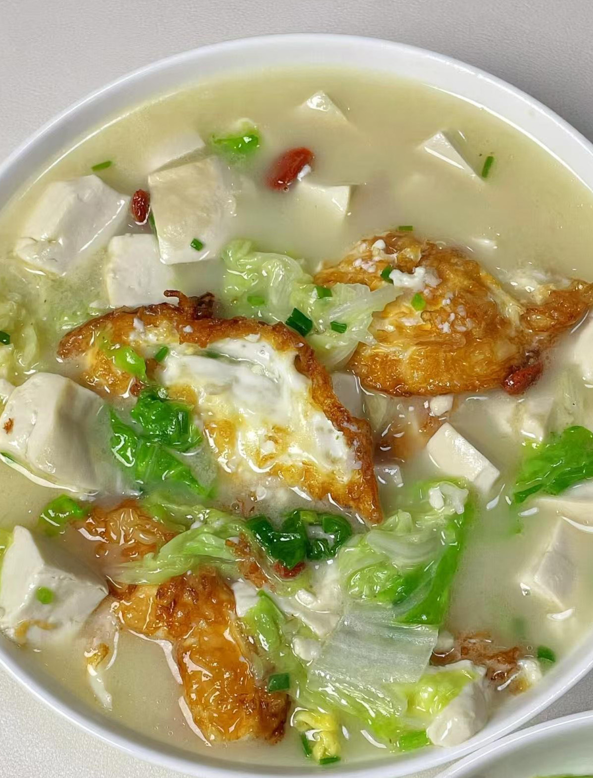 放荷包蛋、豆腐、白菜,加盐调味,撒葱花枸杞汤鲜味美,营养满满,给长辈做超合适,春天喝着养人~