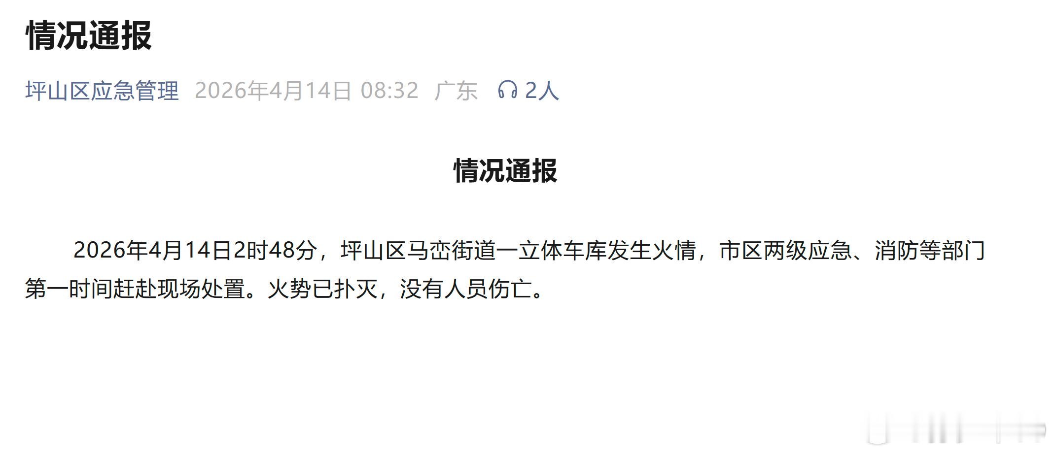 坪山区应急管理发布通报,立体车库的火势已经扑灭车库是放试验车辆的,人没事就好 官