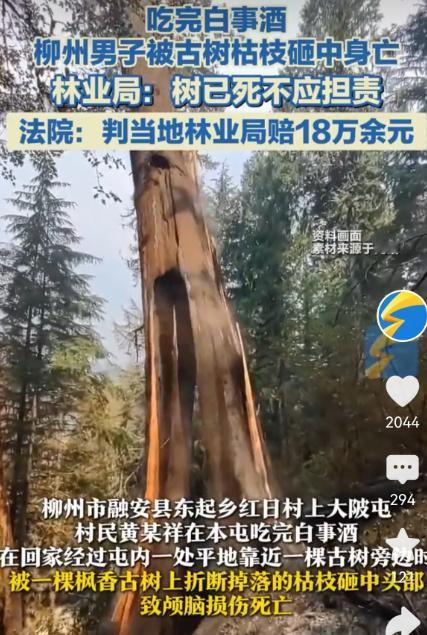 广西柳州,一男子去参加同村白事酒后返回路上,经过村里一棵树龄达160年的枫香古树旁时,被树上折断掉落的枯枝砸中头部,致颅脑损伤死亡。男子家属万分悲痛,预追究古树所有人责任。而所有人表示,古树枯枝掉落曾砸中村民房屋,存在安全隐患,已向林业站报告要求处理,让其找林业局。林业局认为,该古树已枯死并已注销,林业局不应当承担管理人责任。男子家属将来回踢皮球的古树管理人及林业局一起告上法庭,法院这样判的!