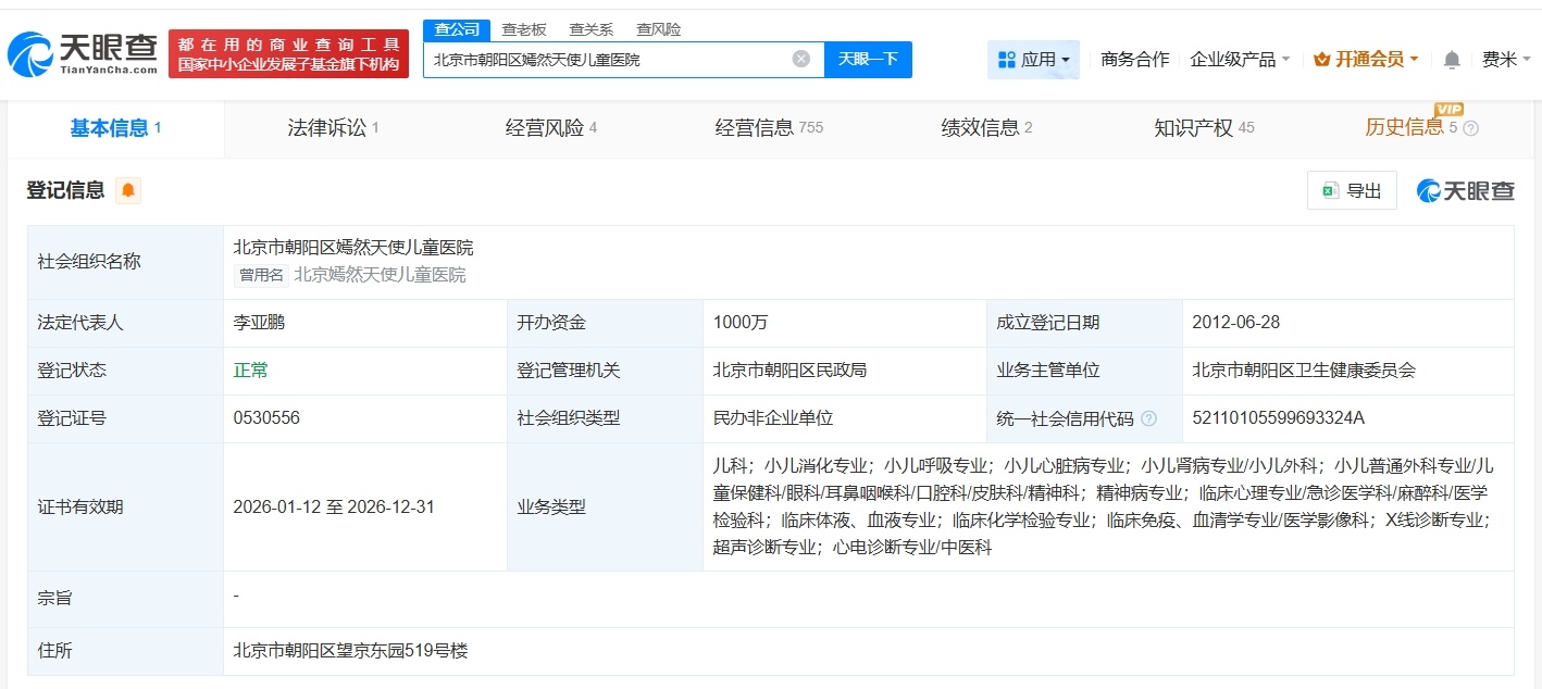 【#嫣然医院及旗下公司均在朝阳区#】#嫣然医院今年刚成立电商公司# 据媒体报道,近日,北京嫣然天使儿童医院拖欠房租一事引发关注,此前,陈光标称李亚鹏已确定嫣然医院新地址就在北京朝阳区。天眼查App显示,北京市朝阳区嫣然天使儿童医院成立于2012年6月,法定代表人为李亚鹏,注册资本1000万人民币,业务类型包括儿科、小儿消化专业、小儿呼吸专业等。对外投资信息显示,该医院对外投资北京微笑守护医疗科技有限公司。今年2月,后者成立了北京嫣然益笑电子商贸有限公司。值得一提的是,北京市朝阳区嫣然天使儿童医院、北京微笑守护医疗科技有限公司、北京嫣然益笑电子商贸有限公司的注册地址均在朝阳区。#嫣然医院不再续租#