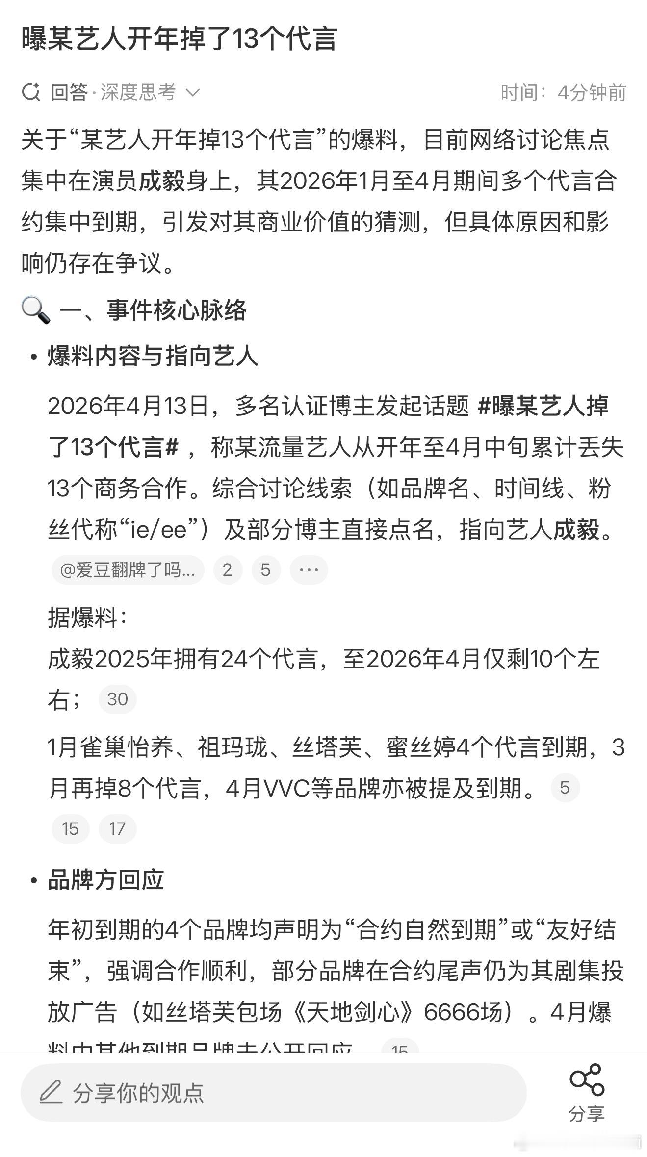 曝某艺人开年掉了13个代言 智叟回答这个某艺人是“成毅”。