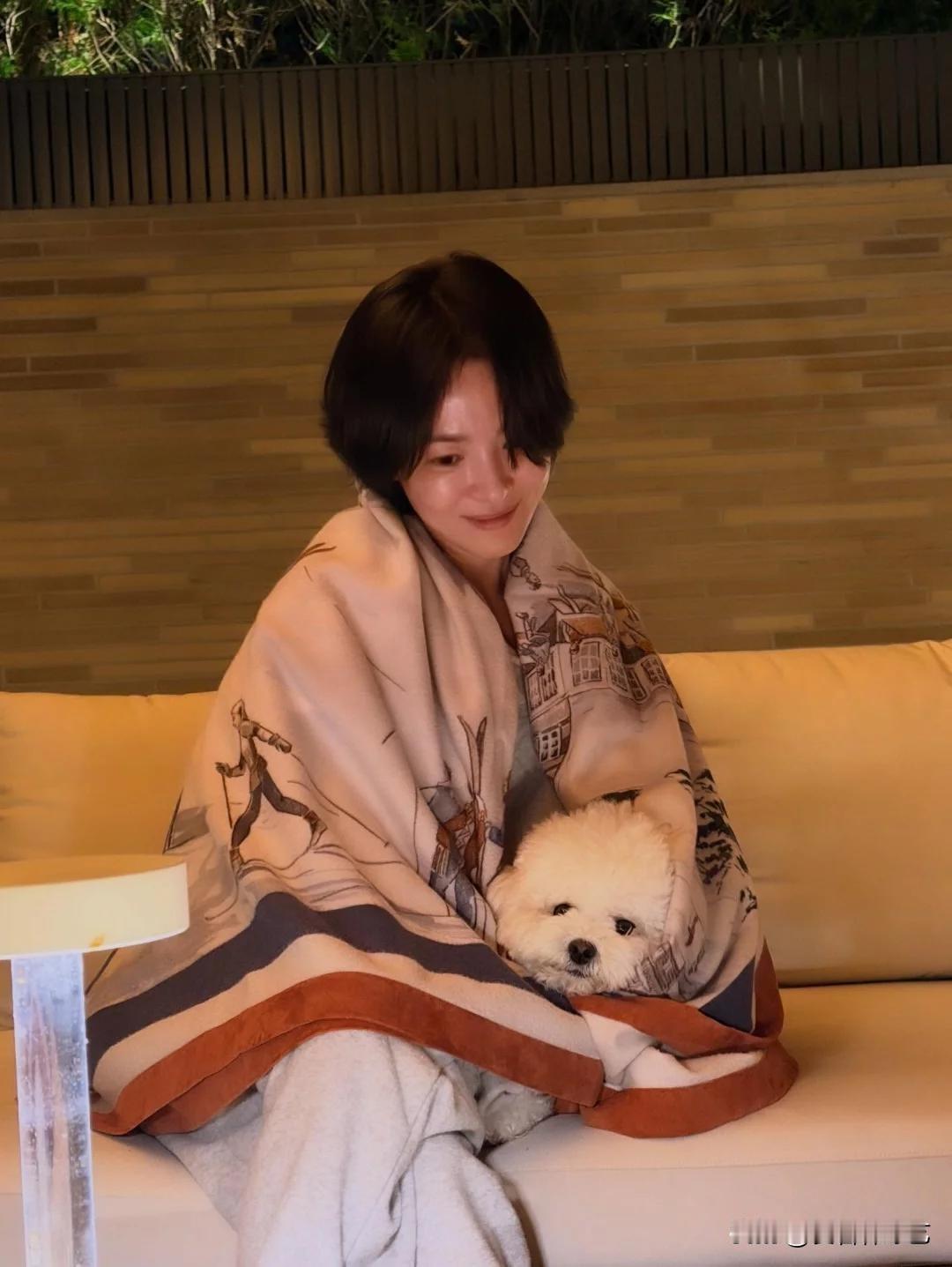 12日,演员宋慧乔在Instagram上上传了照片。公开的照片中,宋慧乔裹着印着手绘图案的毛毯蜷在沙发里,蓬松的白狗狗窝在她臂弯,软乎乎的毛团贴着她的掌心,连小狗耷拉的眼皮都透着慵懒。