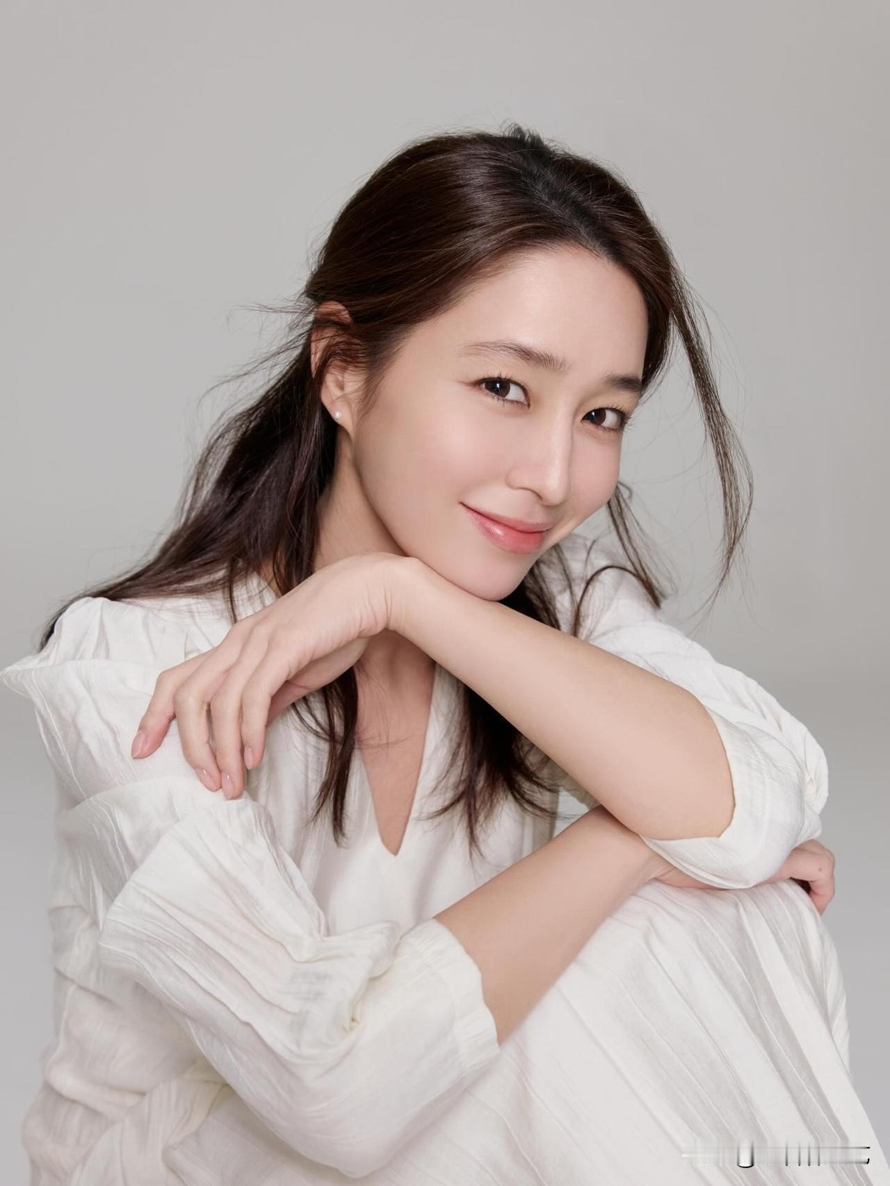 另外,李敏贞手肘轻抵膝头,手掌托着下颌,姿态慵懒又松弛。唇角漾着浅浅笑意,眉眼温柔缱绻,素净的背景里,气质温润如玉,满是不费力的优雅,让人看了心生柔软。