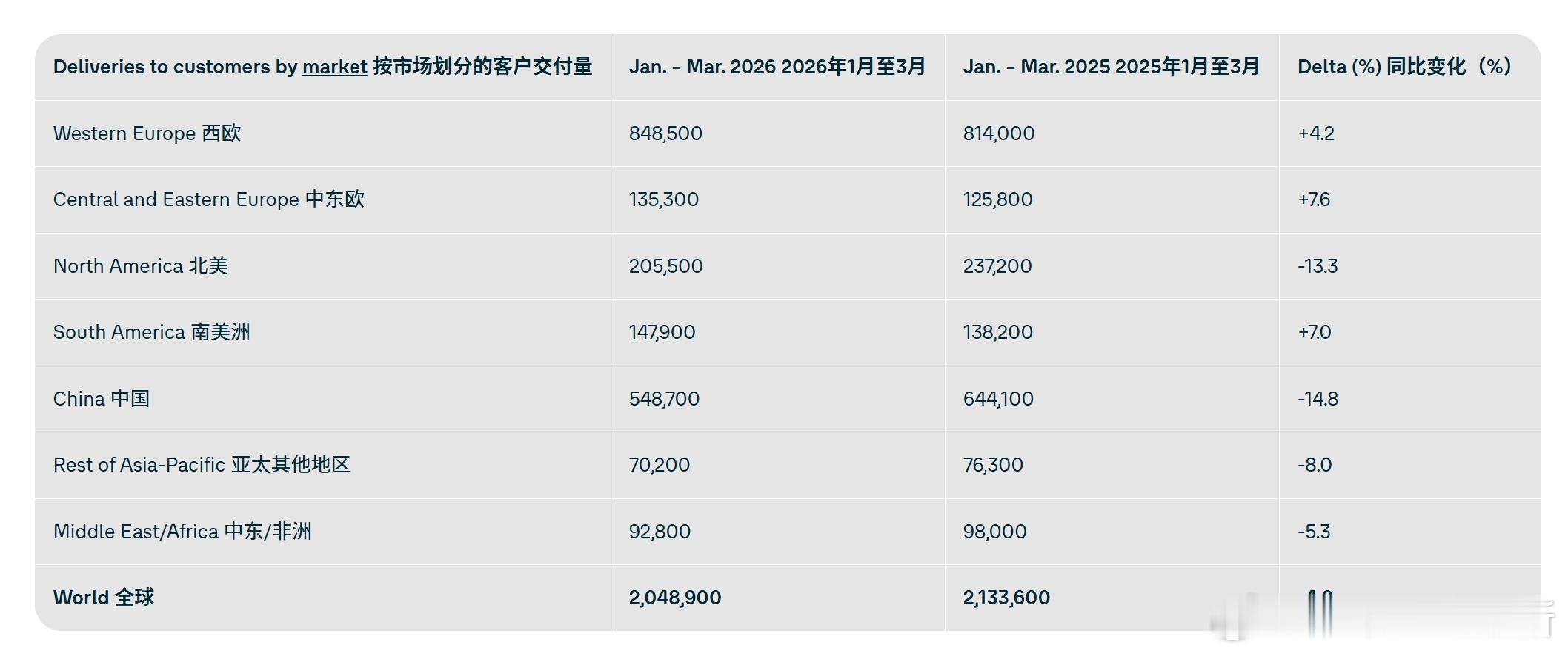 全球交付量达 204.89 万辆,同比减少 4%,其中中国市场交付量为 54.87 万辆,同比减少 14.8%。