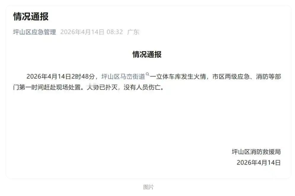经坪山区应急管理通报,起火时间为凌晨2时48分,地点为园区内一立体车库。市区两级应急、消防部门迅速响应,第一时间赶赴现场处置,火势已彻底扑灭,未造成人员伤亡。