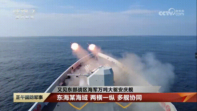 054A护卫舰火力全开,主炮最大射速射击。