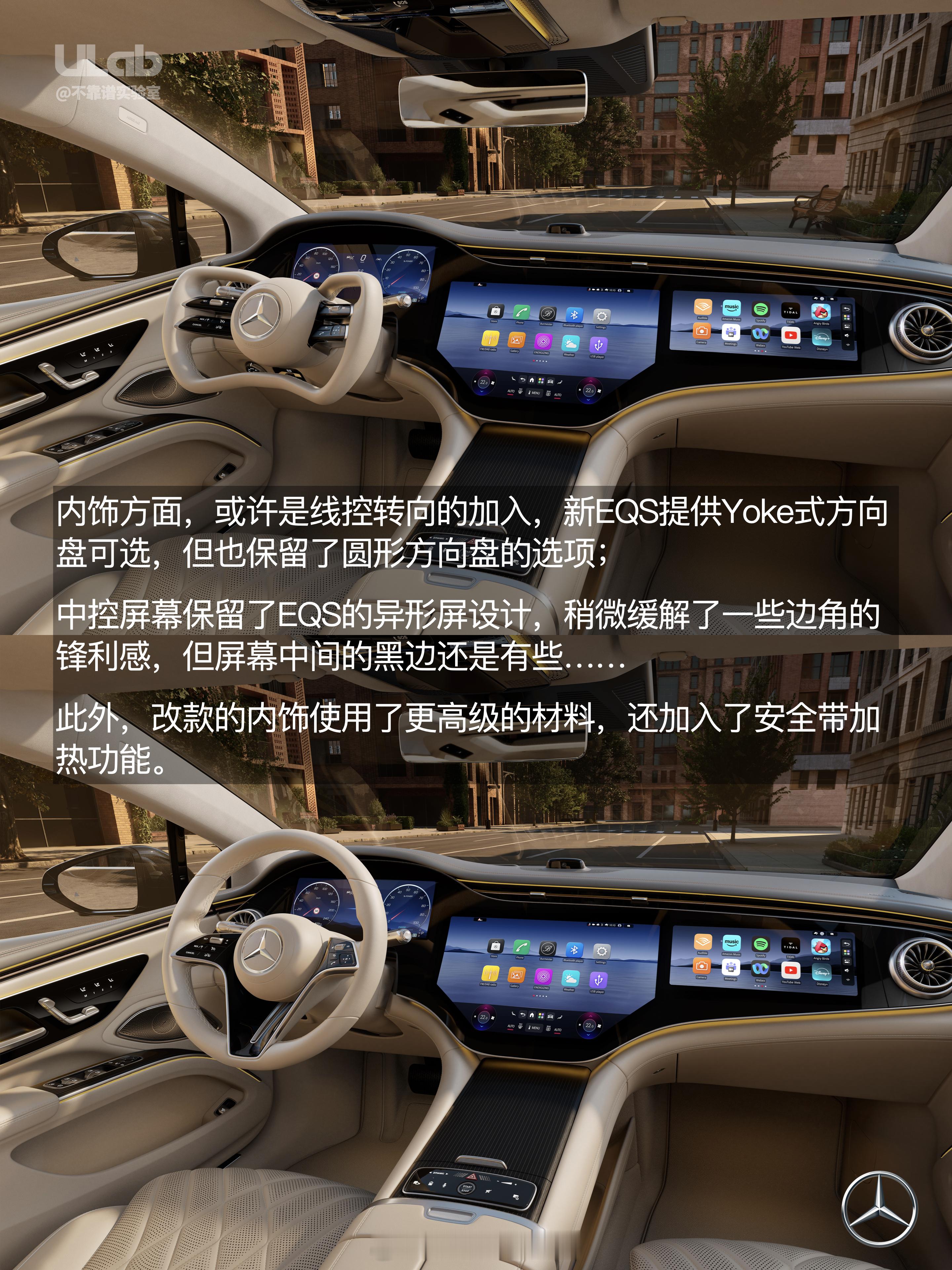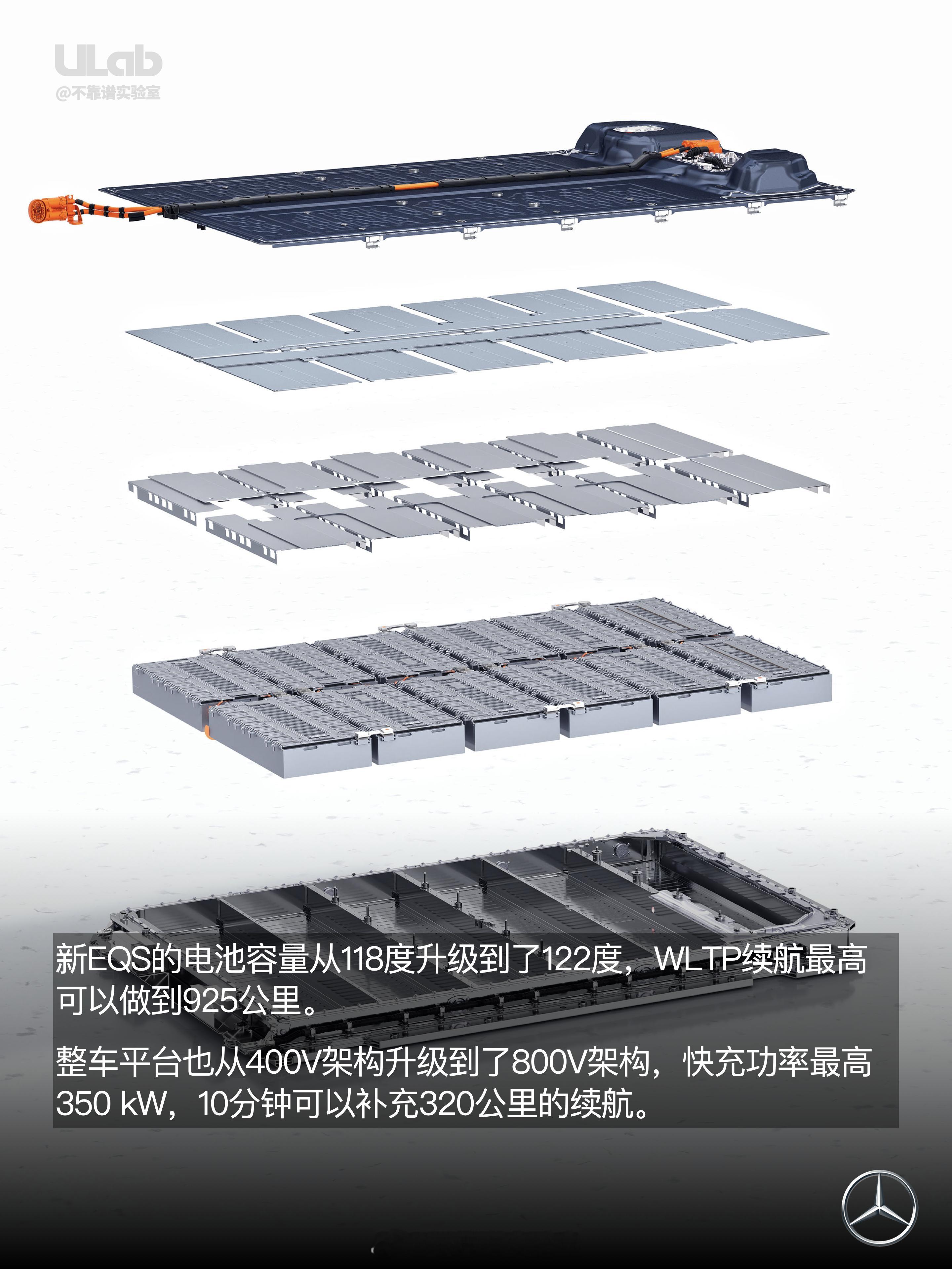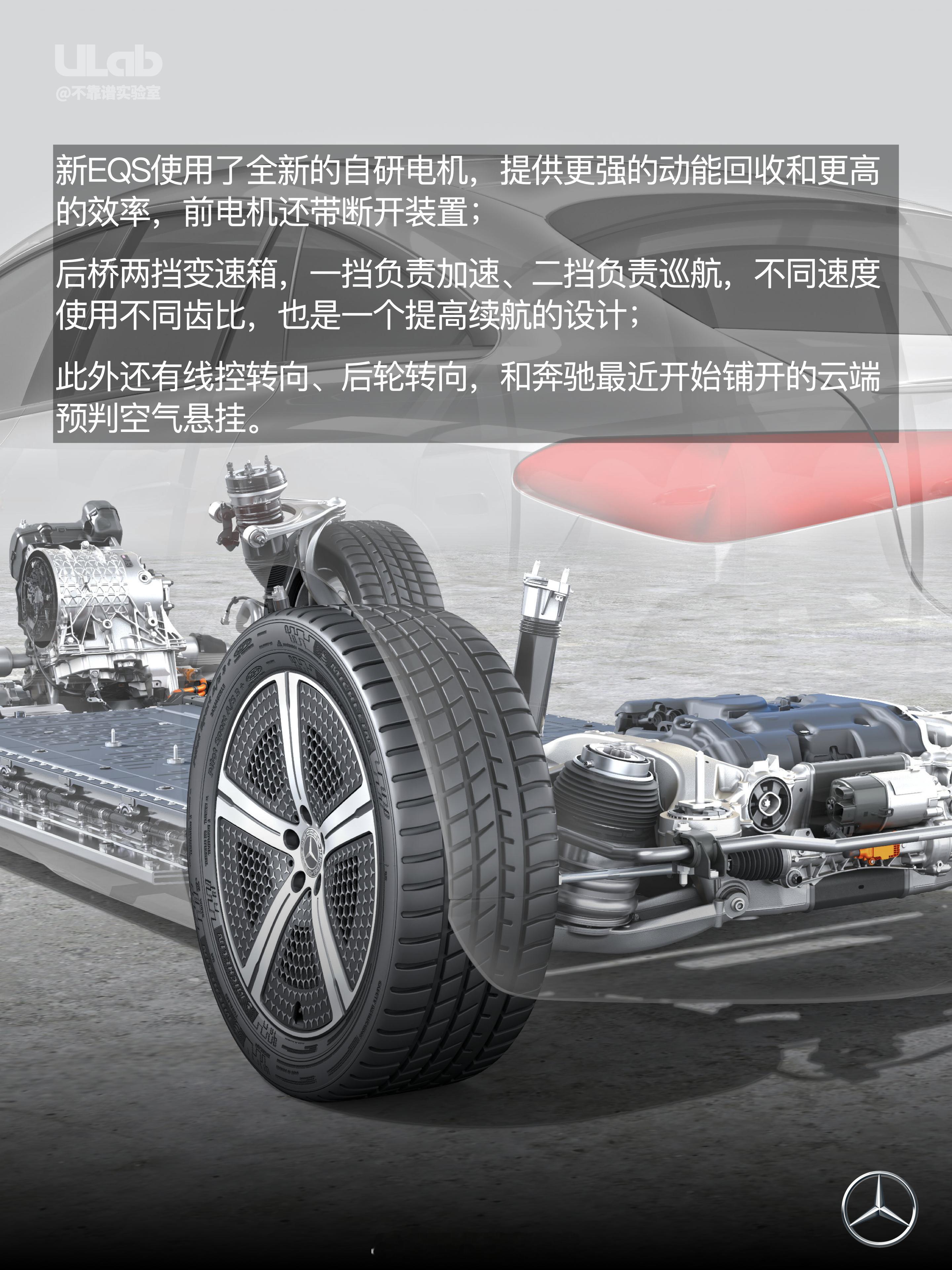 ➡️全新自研电机、后桥两挡变速箱,提升效率优化续航。➡️线控转向、后轮转向。➡️全车架构从400V升级到800V,自研电机、后桥两挡变速箱、线控转向。➡️电池容量从118度升级到了122度,WLTP续航最高可以做到925公里。➡️增加一款EQS 400入门配置。大v聊车车评精选汽场全开奔驰