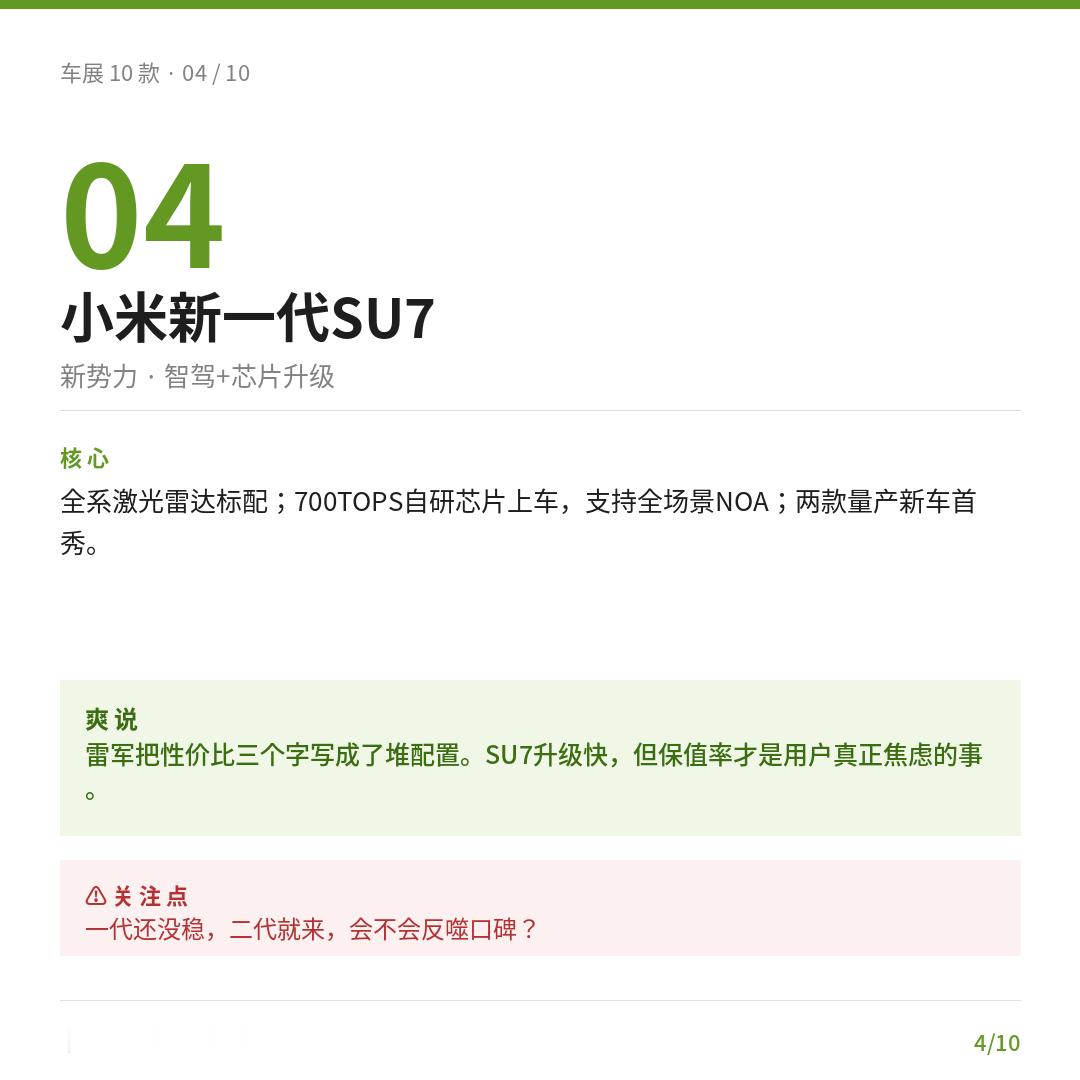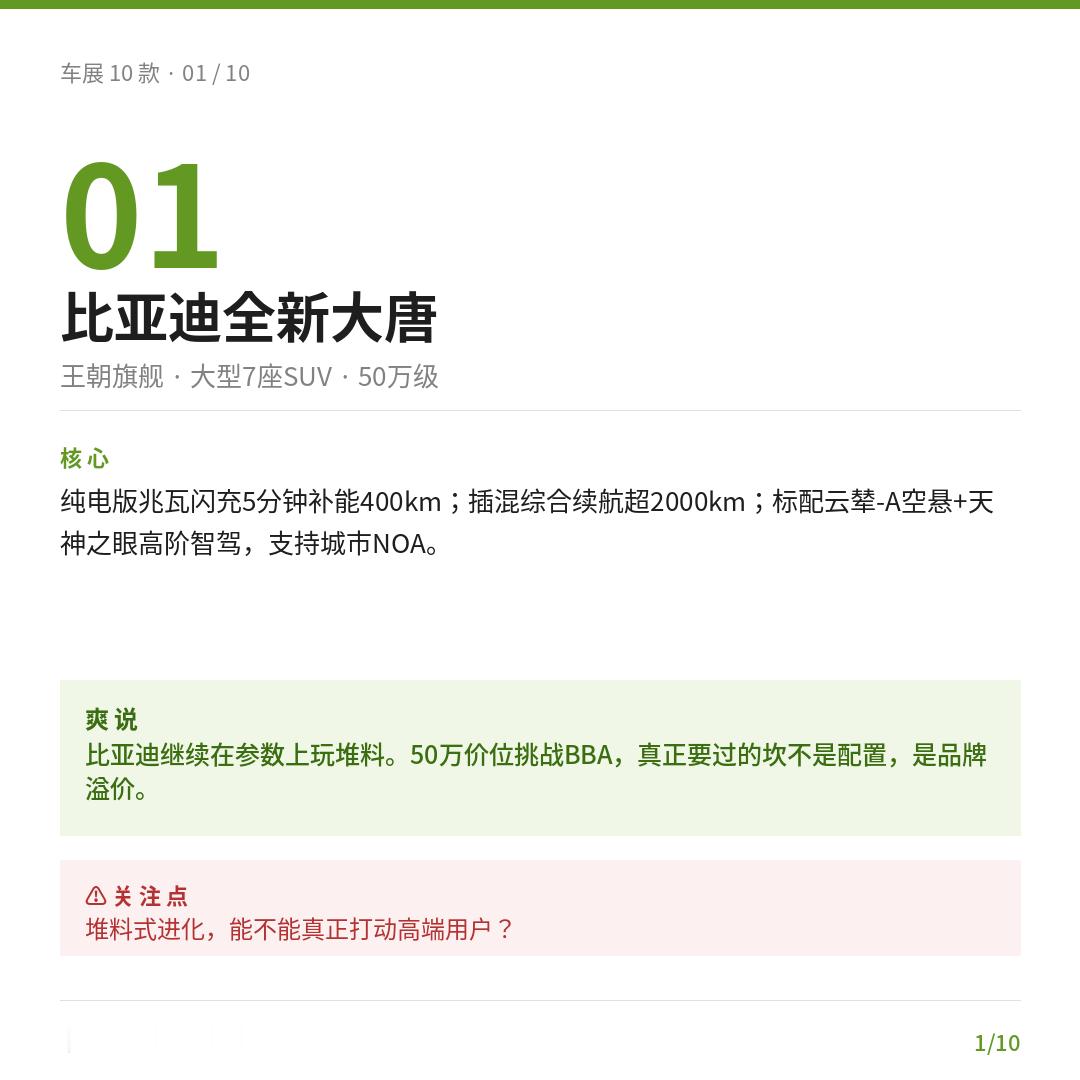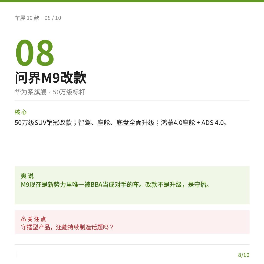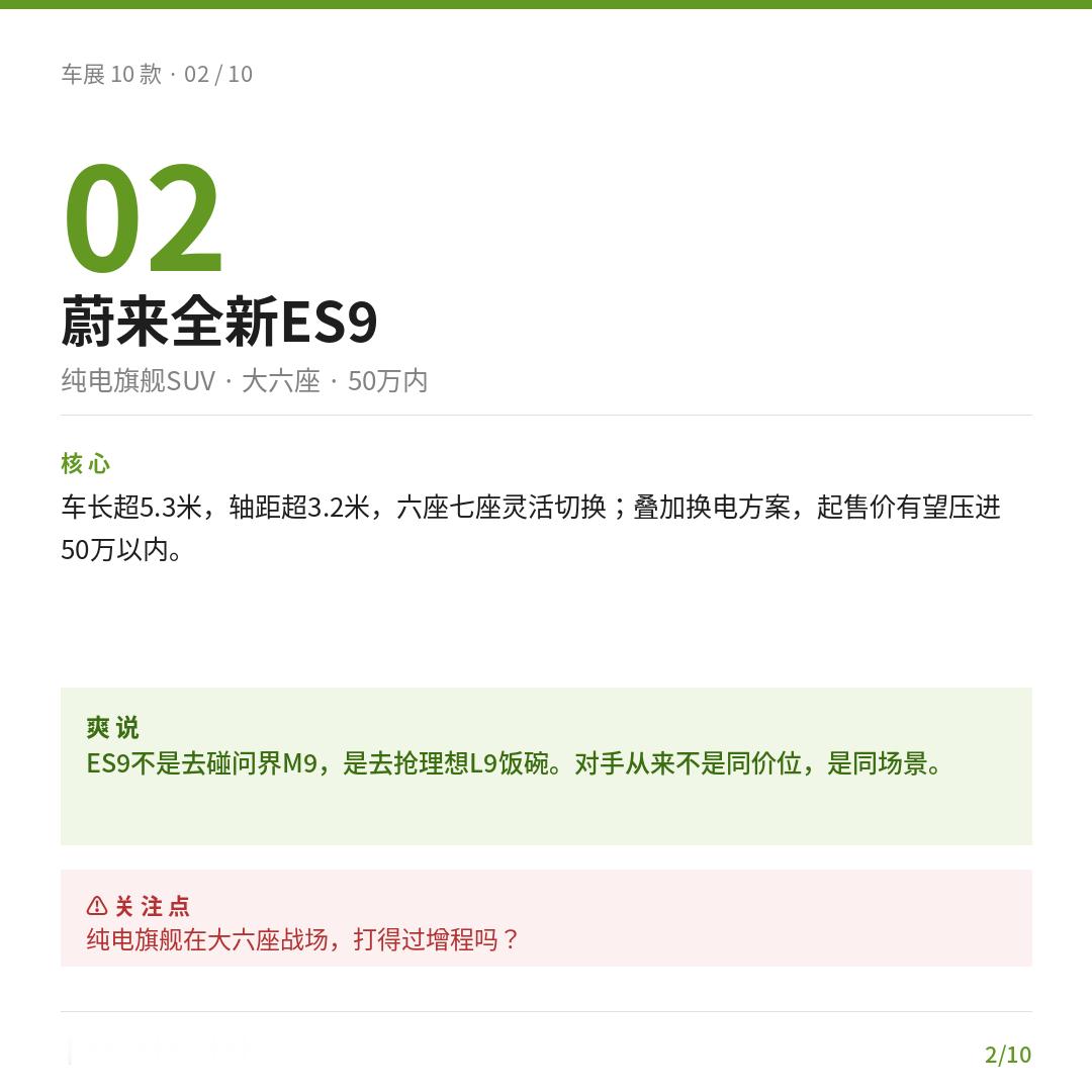 距离北京车展开幕还有10天。我把10款必看新车的功课做完了,11张图存一下,慢慢看👇① 比亚迪全新大唐——王朝旗舰冲50万② 蔚来全新ES9——纯电大六座搅局者③ 宝马新世代iX3/i3长轴——BBA反击战④ 小米新一代SU7——雷军的二次答卷⑤ 奕境首款SUV——华为生态新兵⑥ 尚界Z7+智界V9——鸿蒙九连发⑦ 极氪8X——吉利冲高50万⑧ 问界M9改款——50万标杆守擂⑨ 上汽大众ID.ERA 9X——合资学聪明⑩ 理想i8/i9——增程王转型纯电每款都标了爽说和关注点。今年车展最大的看点,不是新车多,是话语权换人了——自主抢话筒,合资补课。你最期待哪一款?评论区见。
