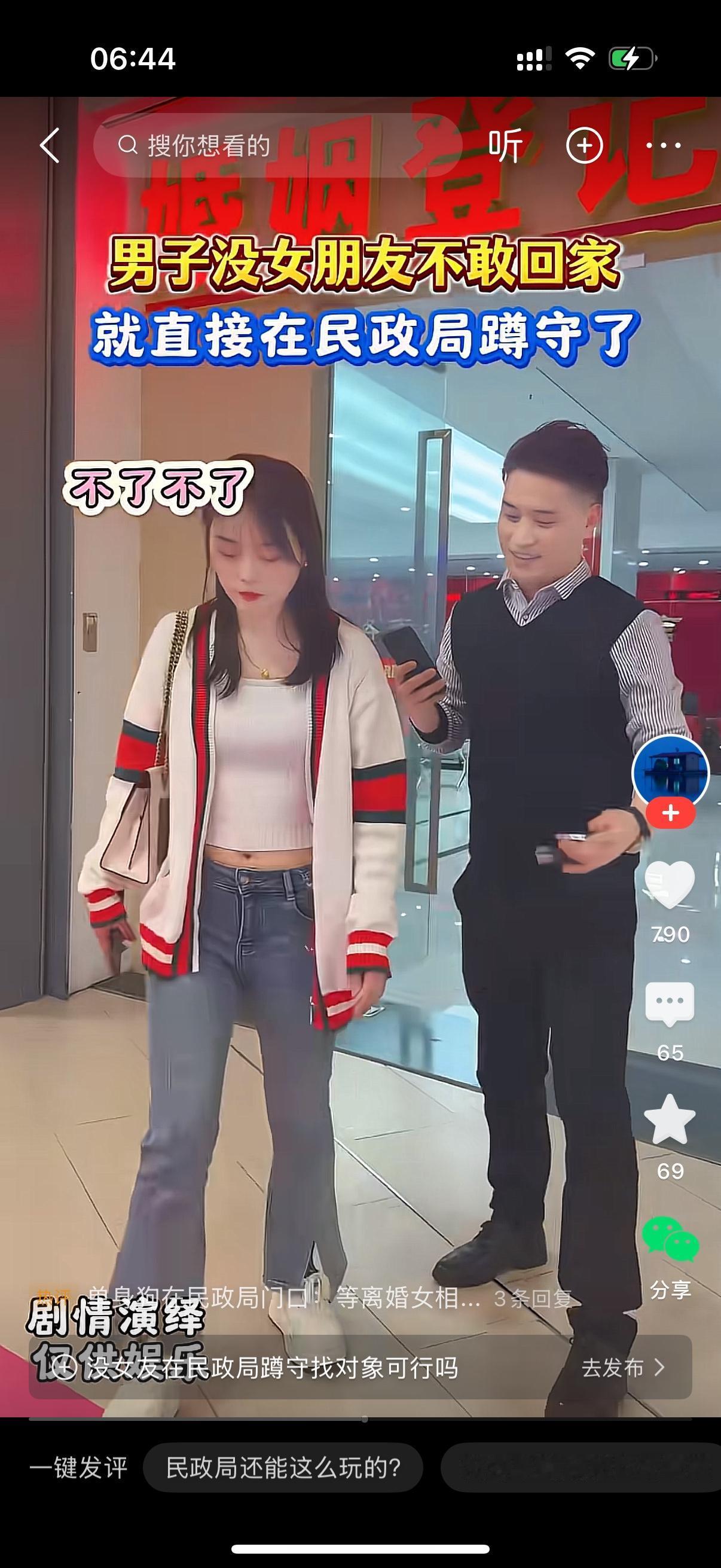 男子没有女朋友,不敢回家。他突发奇想,在民政局门口蹲守那些离异妇女。男子见到一个少妇失魂落魄地走出来,就过去问,美女,离婚了吗?美女回答,是的。男子说,那加个微吧?美女摆了摆手说,不。男子把车钥匙给美女看了一眼,这是我的车。美女高兴地说,那咱俩加一下好友吧。看来下一步,男子展示一下房子,美女就得跟他结婚了。
