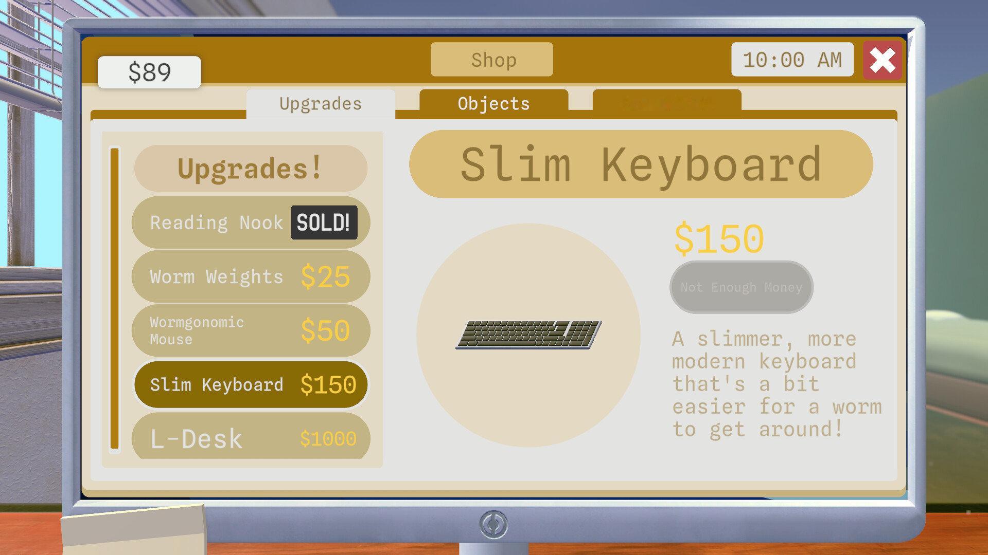 在这款关于远程金融工作的滑稽模拟游戏中,成为“华尔街之虫”吧!用你那没有脊骨的身体在键盘上滚来滚去,投资股市,赚取令人发指的巨额财富。购买升级、训练技能,然后一步步——蠕动着——爬上你梦寐以求的晋升之位!