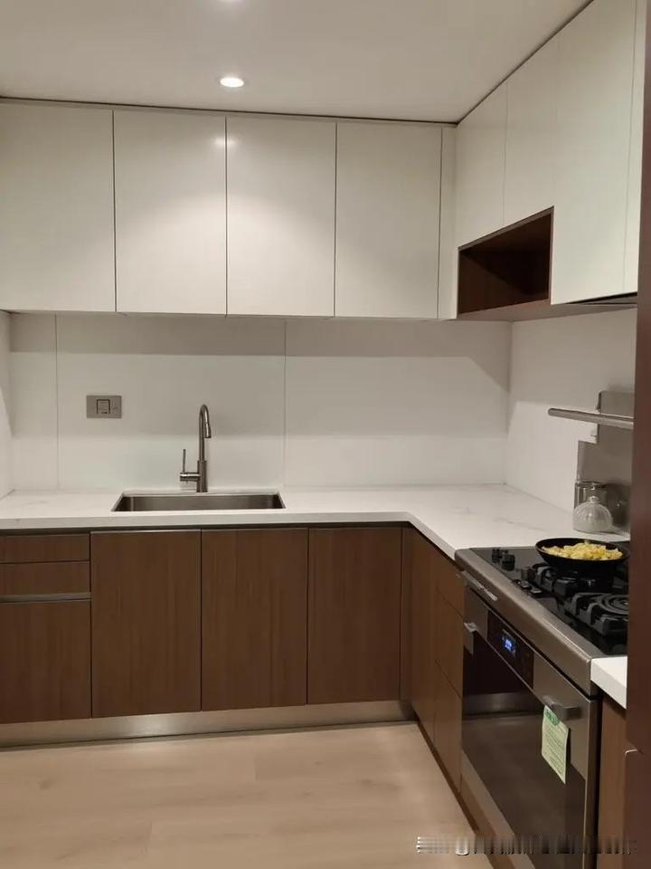 橱柜柜体用304不锈钢独立柜体,台面20MM石英石,吊柜用白色封闭漆,地柜用黑胡桃原木门板。