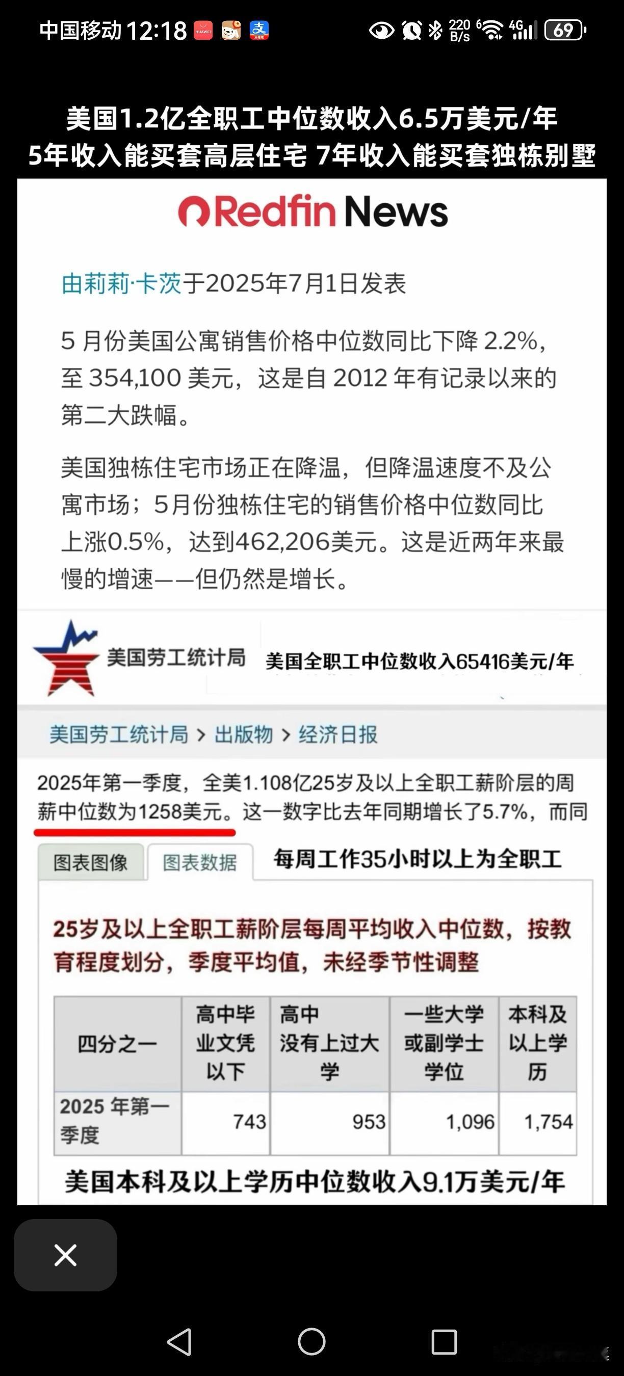另,美国1.2亿全职工中位数收入6.5万美元/年,全国80%以上的人住别墅。上海中位数收入8万/年,参照美国标准,中位数房价应该多钱合理呢?一个人不吃不喝6年能买一套高层中位数商品房吗?