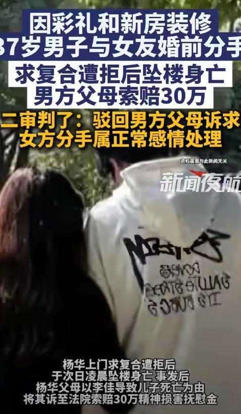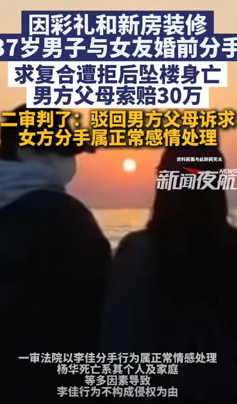 想白嫖?新疆乌鲁木齐,37岁妈宝男和女友恋爱三个月准备结婚,母亲只愿出11000的彩礼,婚房装修还必须听她的,女友和男子分手,第2天男子从楼上一跃而下。事发后,男子母亲多次去女友单位和家里拉横幅闹事,还要求女友赔偿30万。二审判了!