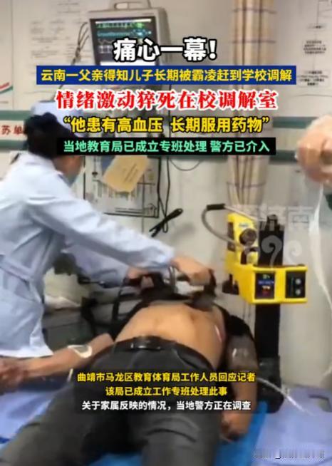 云南曲靖,一女子和丈夫得知15岁儿子在学校被同学索要财物以及殴打后,怒气冲冲地来到学校讨说法。由于情绪过于激动,在调解过程中女子丈夫突然倒地不起。学校虽然提供了AED,但没人会用,女子只得求助120急救中心,并按照医嘱对丈夫施救。可等医护人员赶到现场时,女子丈夫已经身亡。目前,警方以及教体局均已介入调查。
