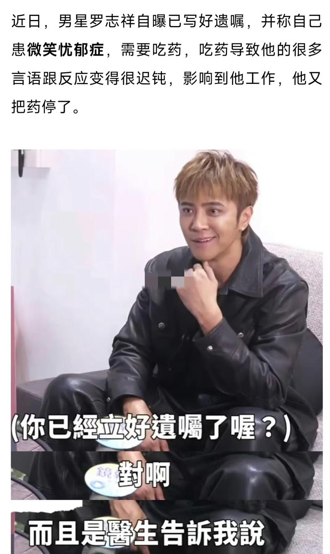不过罗志祥的状态确实让人挺担心,他曾公开承认自己患抑郁症,还说写好了遗嘱,才40多岁就已经安排好了一切,未免有些太过悲观。大家对此怎么看呢?