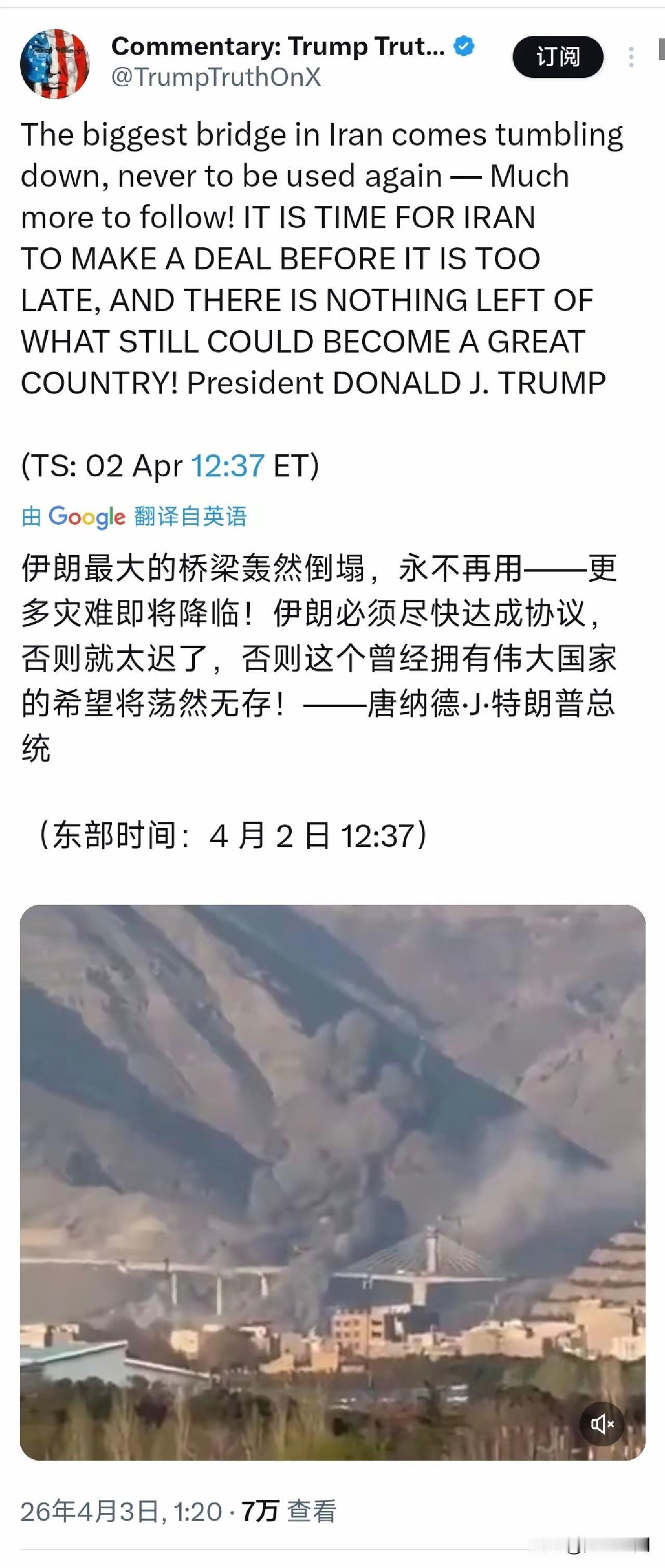 特朗普今天(北京时间4月3日)发文写道:“伊朗最大的桥梁轰然倒塌,永不再用——更