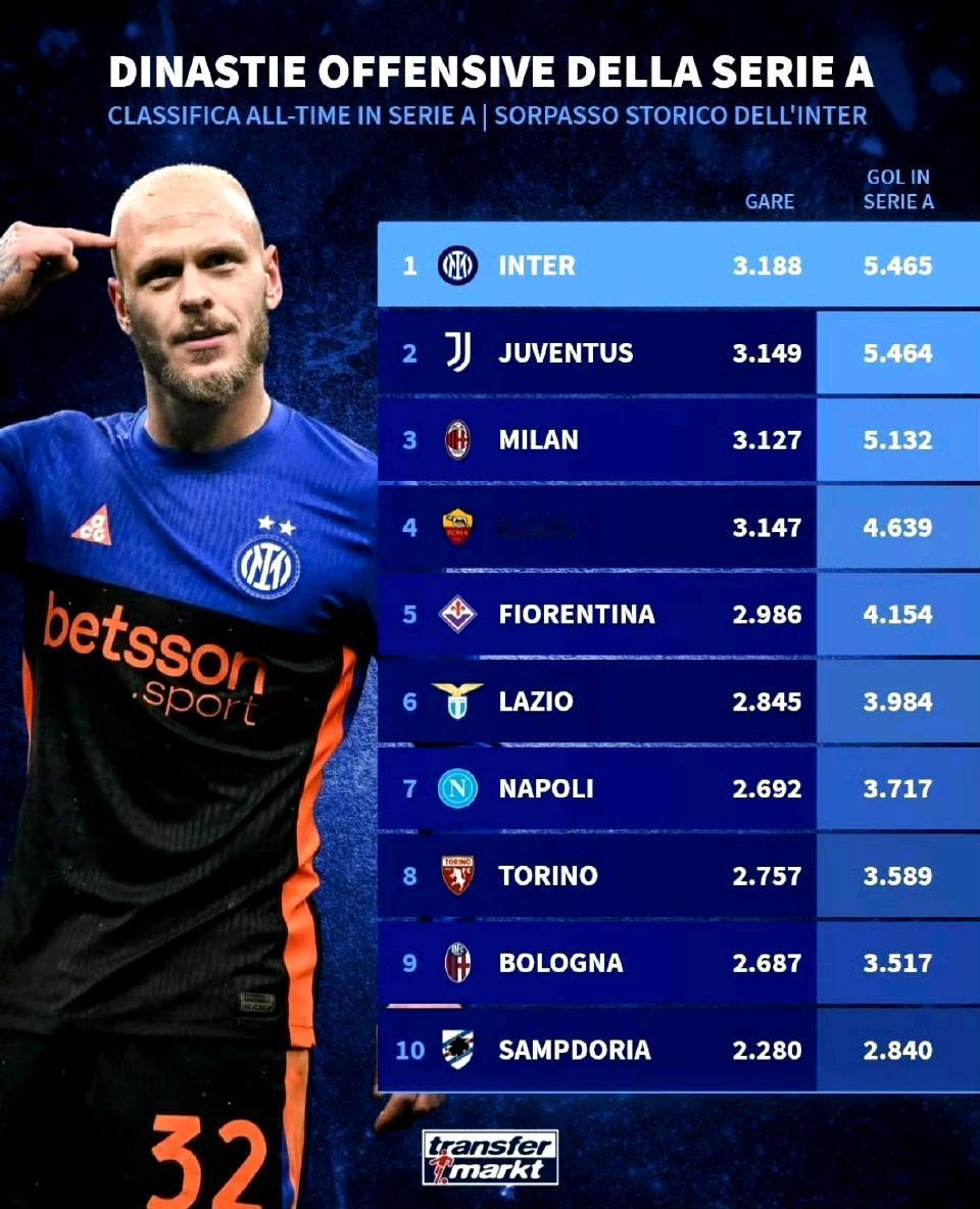 国际米兰竟然超越尤文图斯,成为意甲进球数最多的球队。 国米3188场意甲比赛,