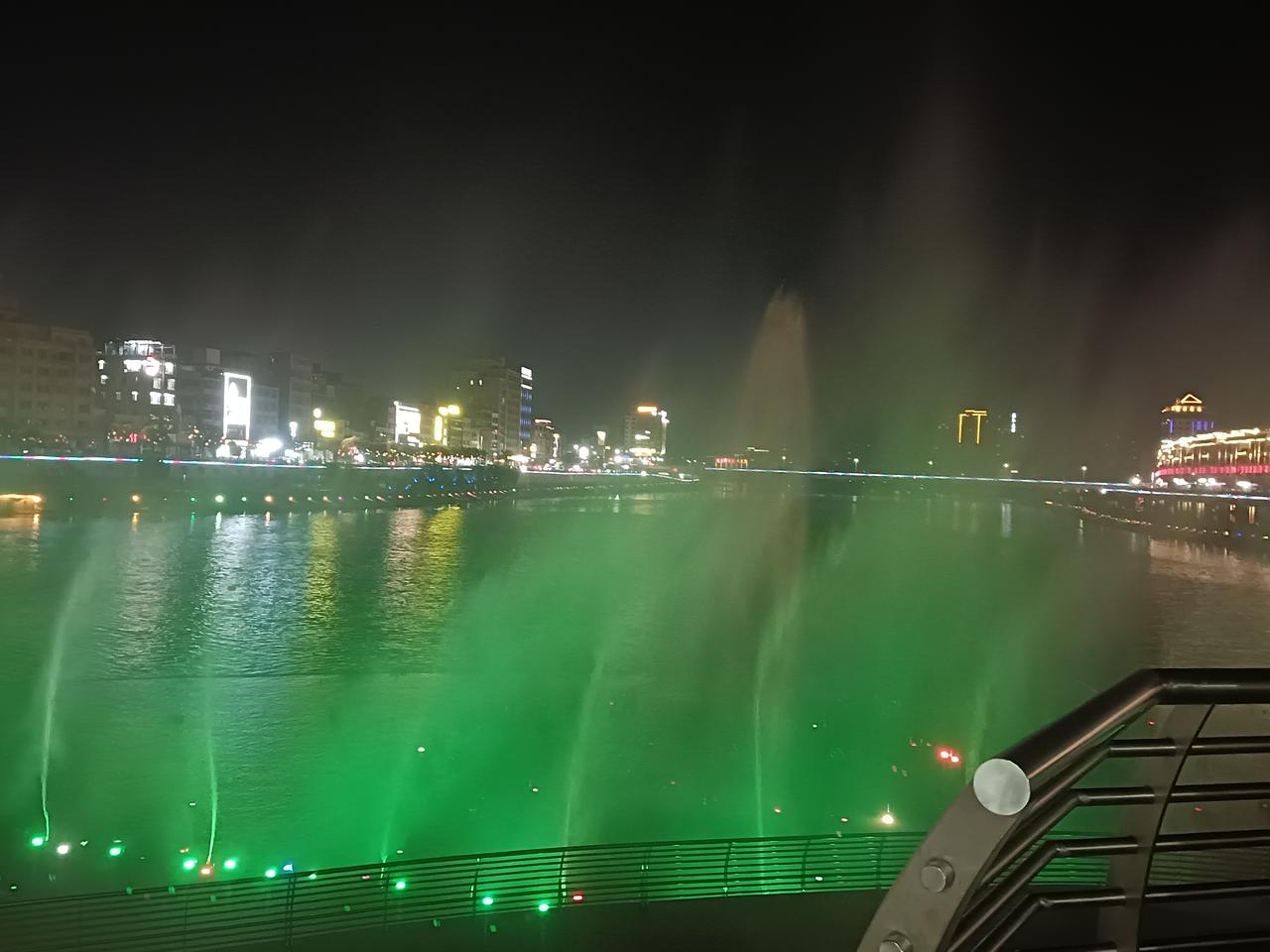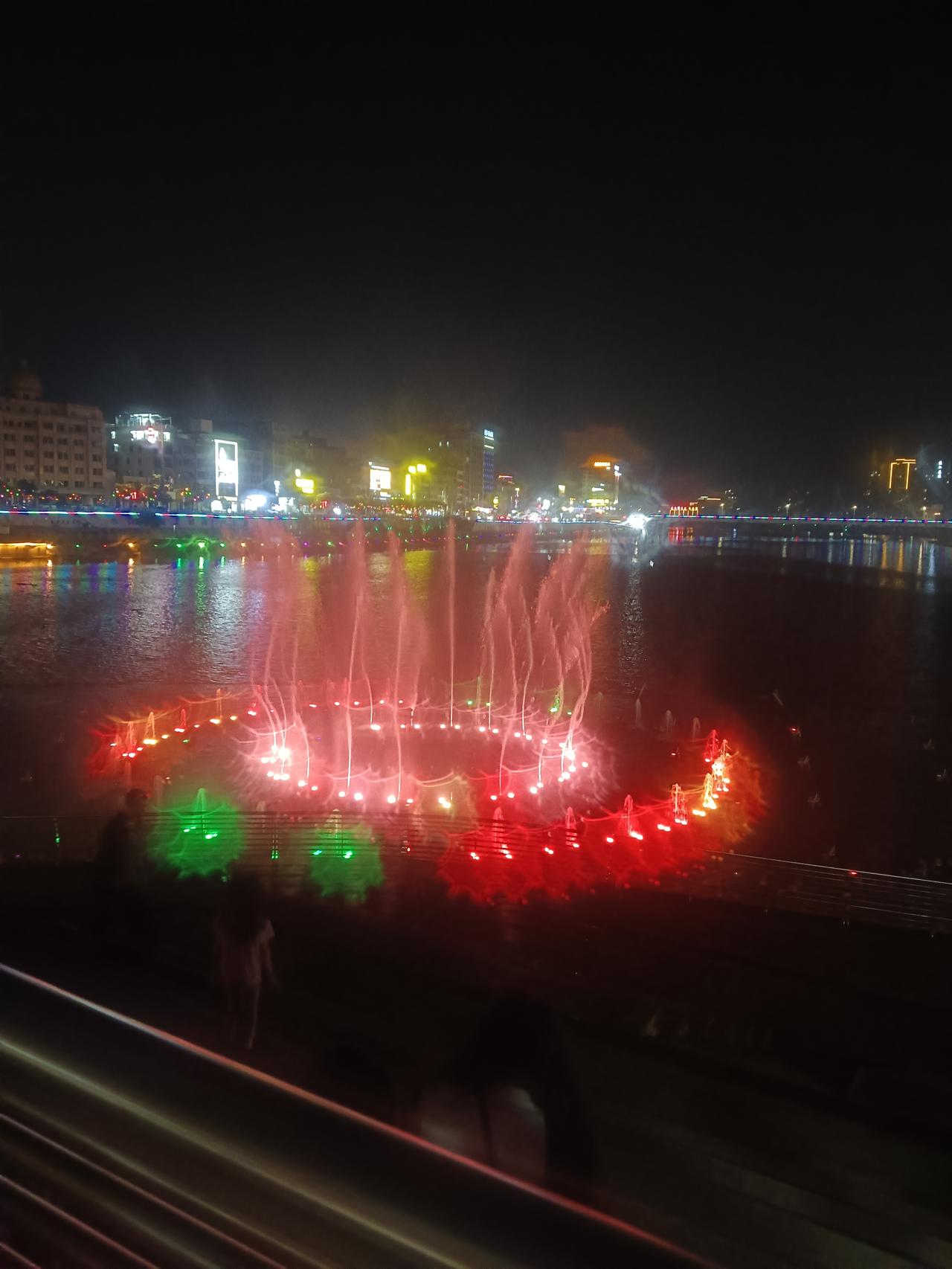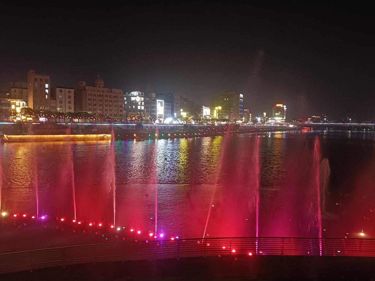 我凭栏立于江畔瞭望台,忽有乐声悠扬而起,彩色喷泉应声腾空,随旋律起伏舞动,千姿百态,绚烂夺目。一群鹭鸟闻声惊起,翩跹盘旋于江面之上,似亦沉醉于此般盛景。