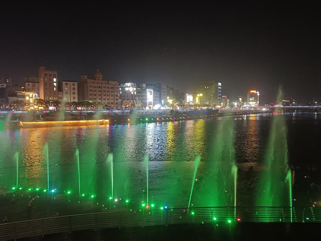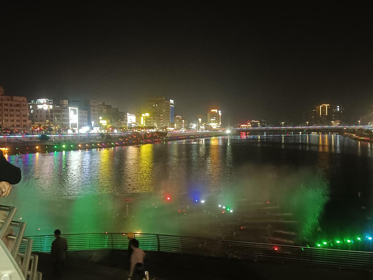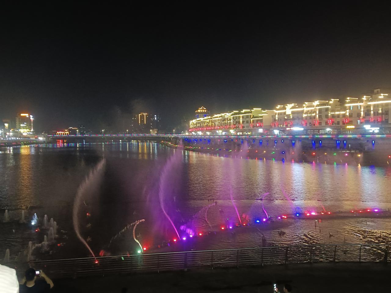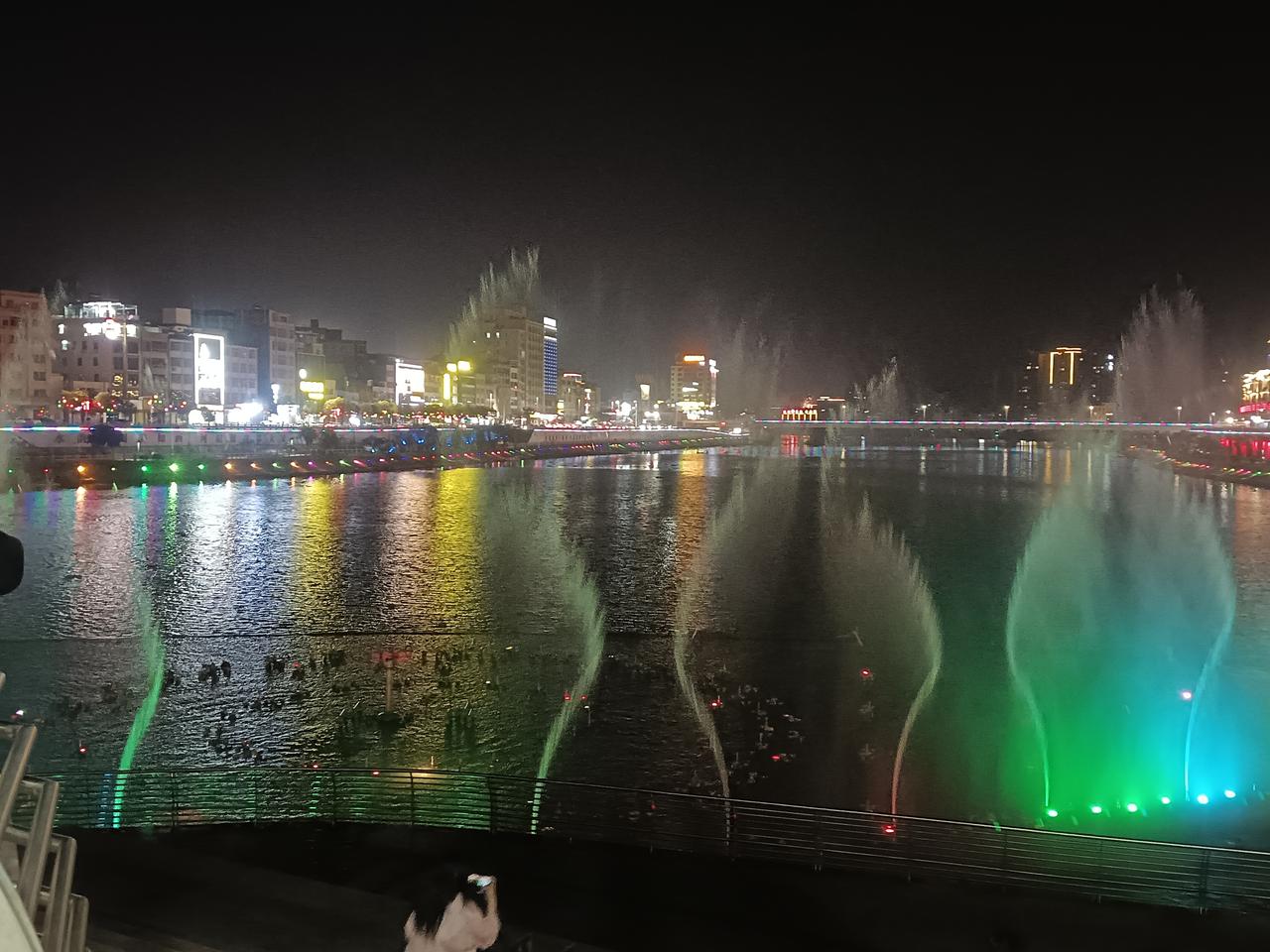 我凭栏立于江畔瞭望台,忽有乐声悠扬而起,彩色喷泉应声腾空,随旋律起伏舞动,千姿百态,绚烂夺目。一群鹭鸟闻声惊起,翩跹盘旋于江面之上,似亦沉醉于此般盛景。