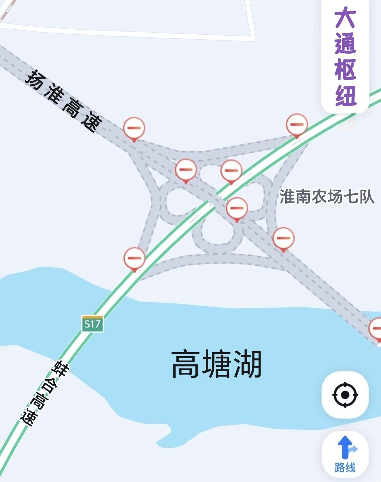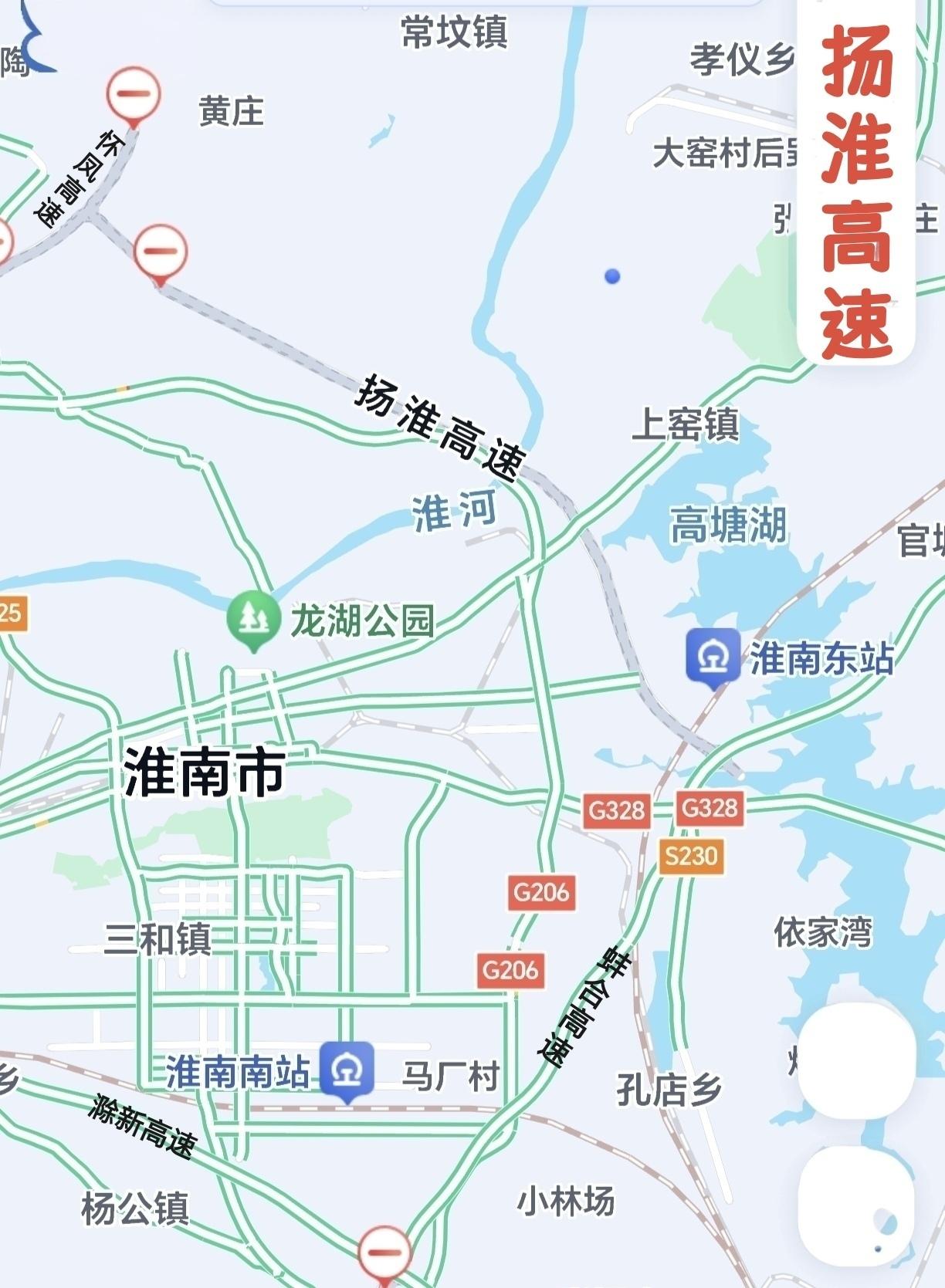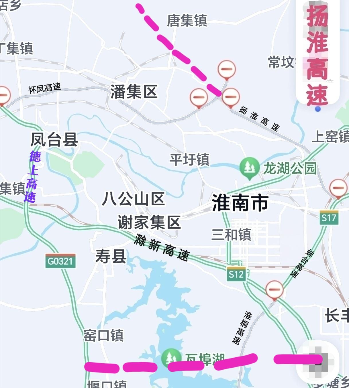 地图也很给力,近日,扬淮高速淮南段已标注出来了。东段在淮南东站南侧与蚌合高速交汇,大通枢纽十分漂亮;西段与怀凤高速交汇,以后会北延至蒙城至淮北。