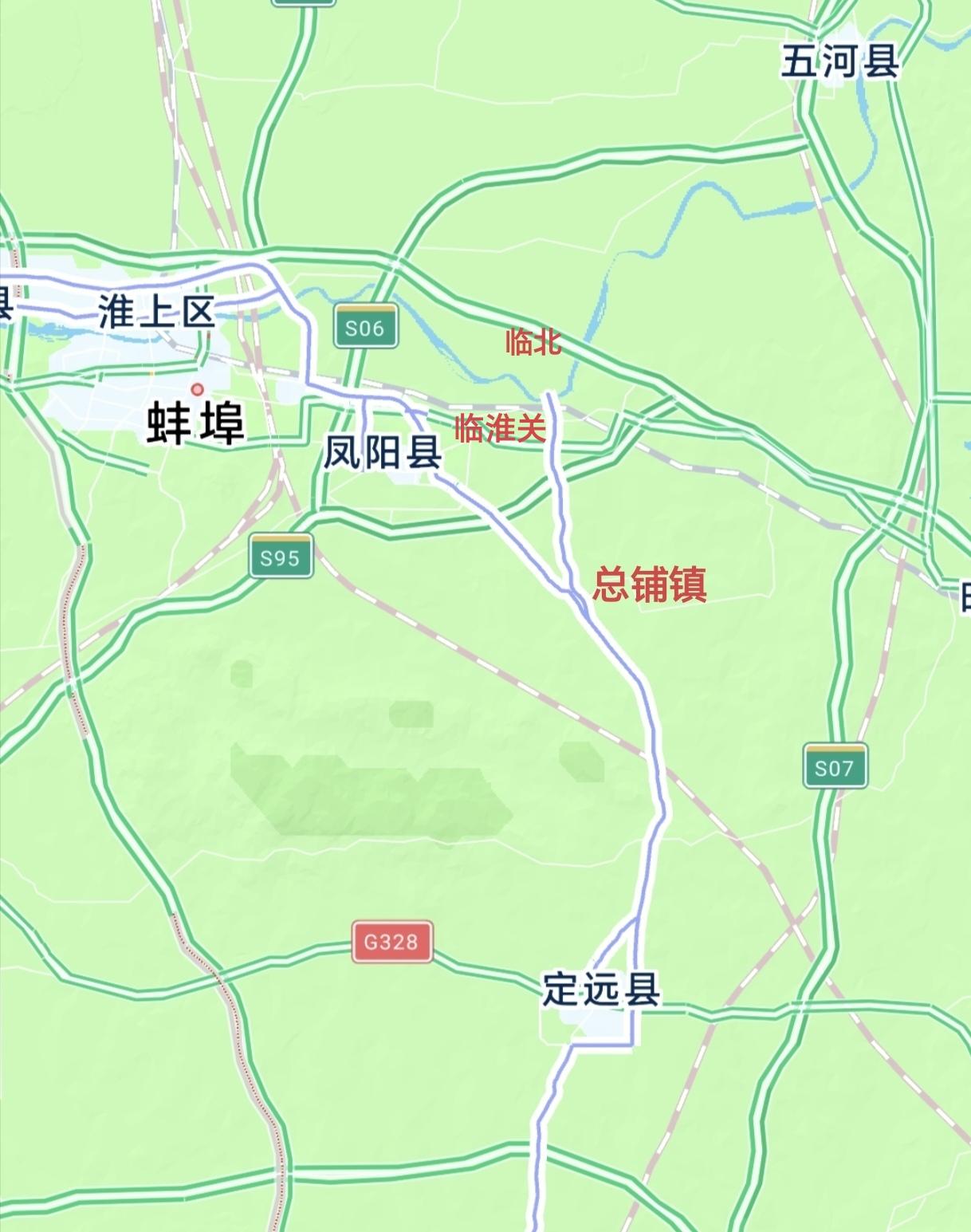 在凤阳县,路线现状是从总铺水库向西北县城方向走行,本次改线直接从总铺向北布线,在临淮关跨过淮河到五河县临北乡,从而避开了县城。