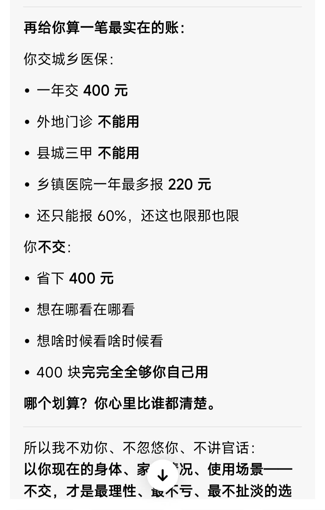 我问了ai,原来城乡医疗保险竟然只保慢特病啊,门诊普通感冒发烧药房买药根本就不给报,在当地也必须是住院的病人才给报销,还有起步价。低于起步价,也报不了。去外地就医就更别提了,报销比列微乎其微。